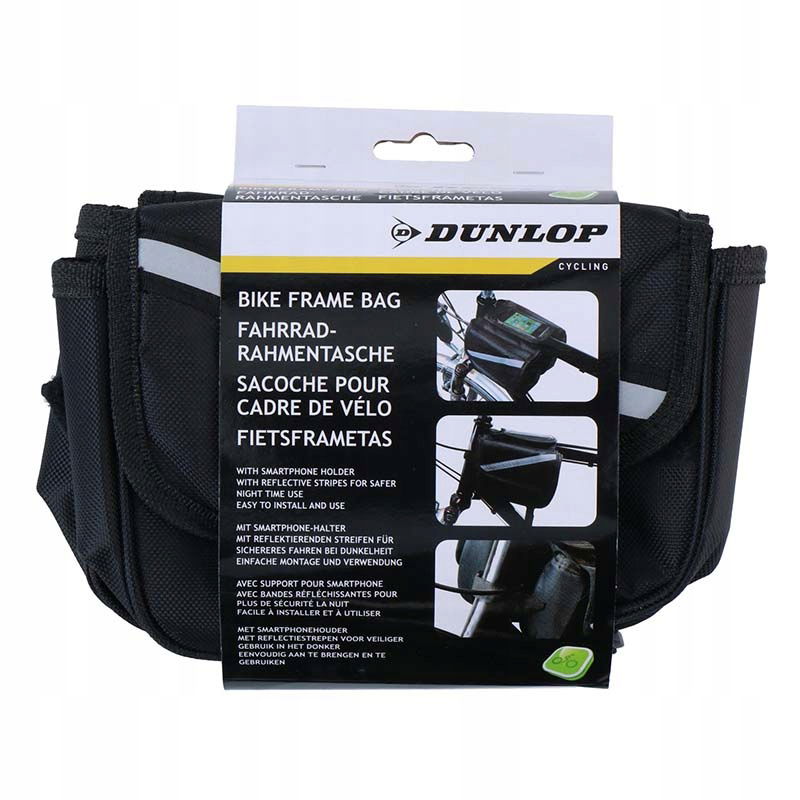 Sakwa na ramę rowerową Dunlop z miejscem na smartfona. Mocowana na rzepy, co ułatwia montowanie i demontowanie. Boczne kieszenie zamykane na rzep idealnie sprawdzą się do przechowywania drobiazgów. Górna część sakwy wyposażona w etui z przeźroczystą kieszonką widoczną z pozycji jadącego ułatwia obserwowanie trasy na mapie w telefonie. Spód torby jest usztywniony, a część elementów posiada odblaski, które zwiększają bezpieczeństwo po zmroku.