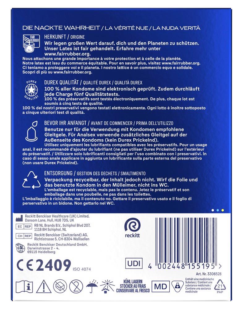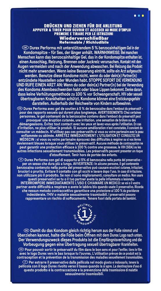 For sex that lasts longer! The transparent Performa condoms from Durex have gel tip that contains 5% benzocaine – this can help to delay climax and prolong the arousal phase. The condoms are covered in silicone-based lubricant. Compared to conventional cylindrical condoms, the innovative and anatomical Easy-on shape offers a little more space in all the right places – this means that they are easier to put on and roll off, as well as fitting comfortably as well.