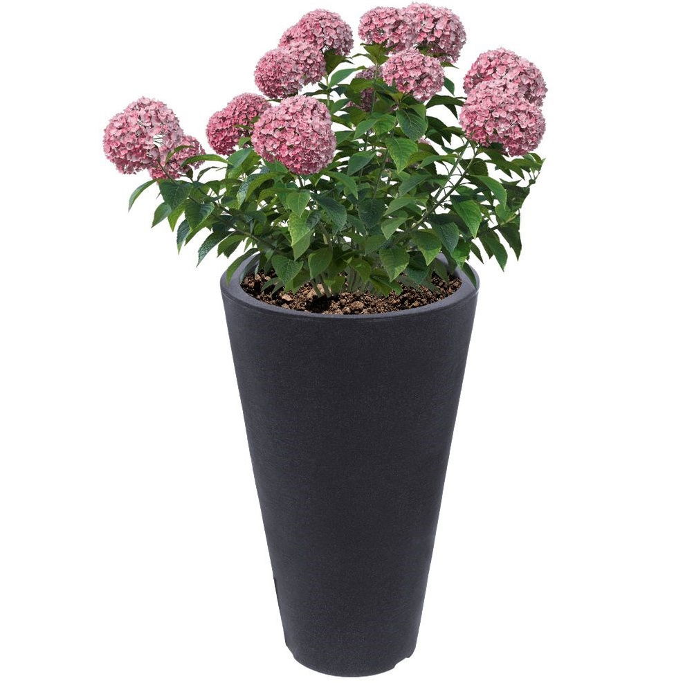 WYTRZYMAŁA - Wykonana z wysokiej jakości tworzywa imitującego kamień w kolorze antracytowym. Tworzywo to jest lekkie, a jednocześnie bardzo wytrzymałe. Doniczka ma stożkowy wygląd, dzięki czemu prezentuje się bardzo efektownie.