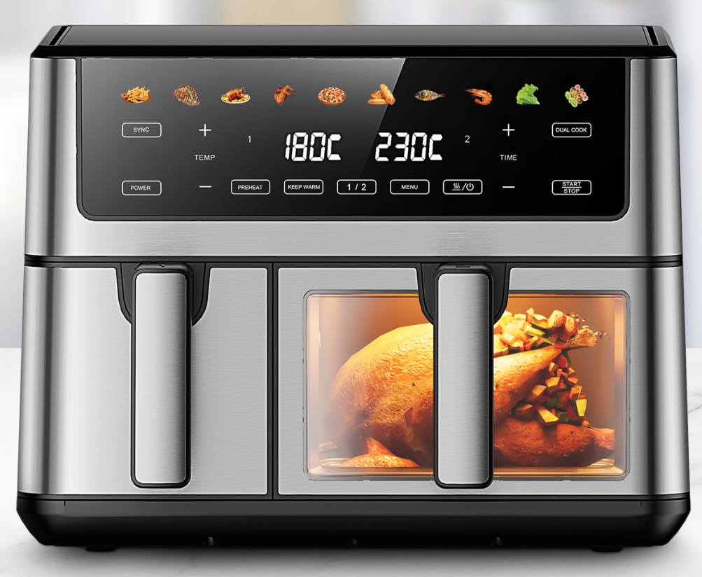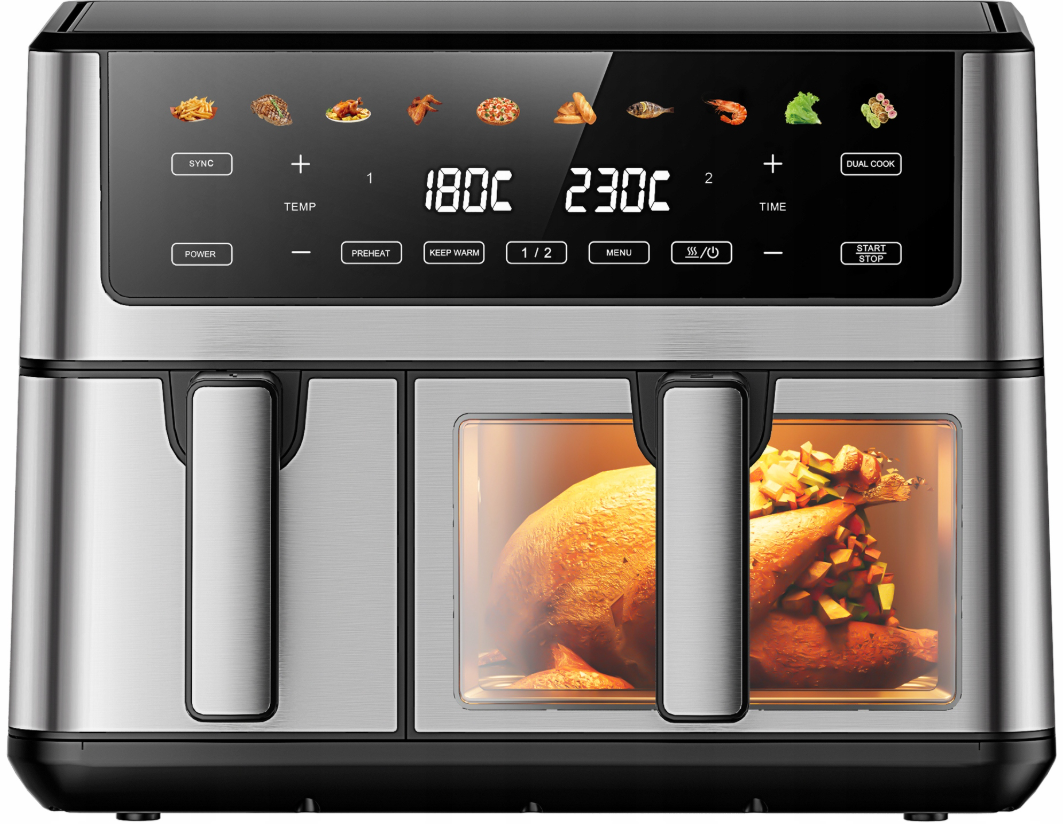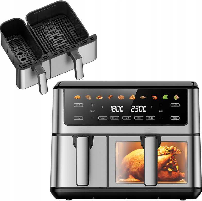 Nowoczesny airfryer z okienkiem Extralink Dual Basket to gotowanie z mniejszą ilością tłuszczu dla całej rodziny. Duża moc, pojemne komory i 10 automatycznych programów – wszystko po to, by jeść pysznie i zdrowo!