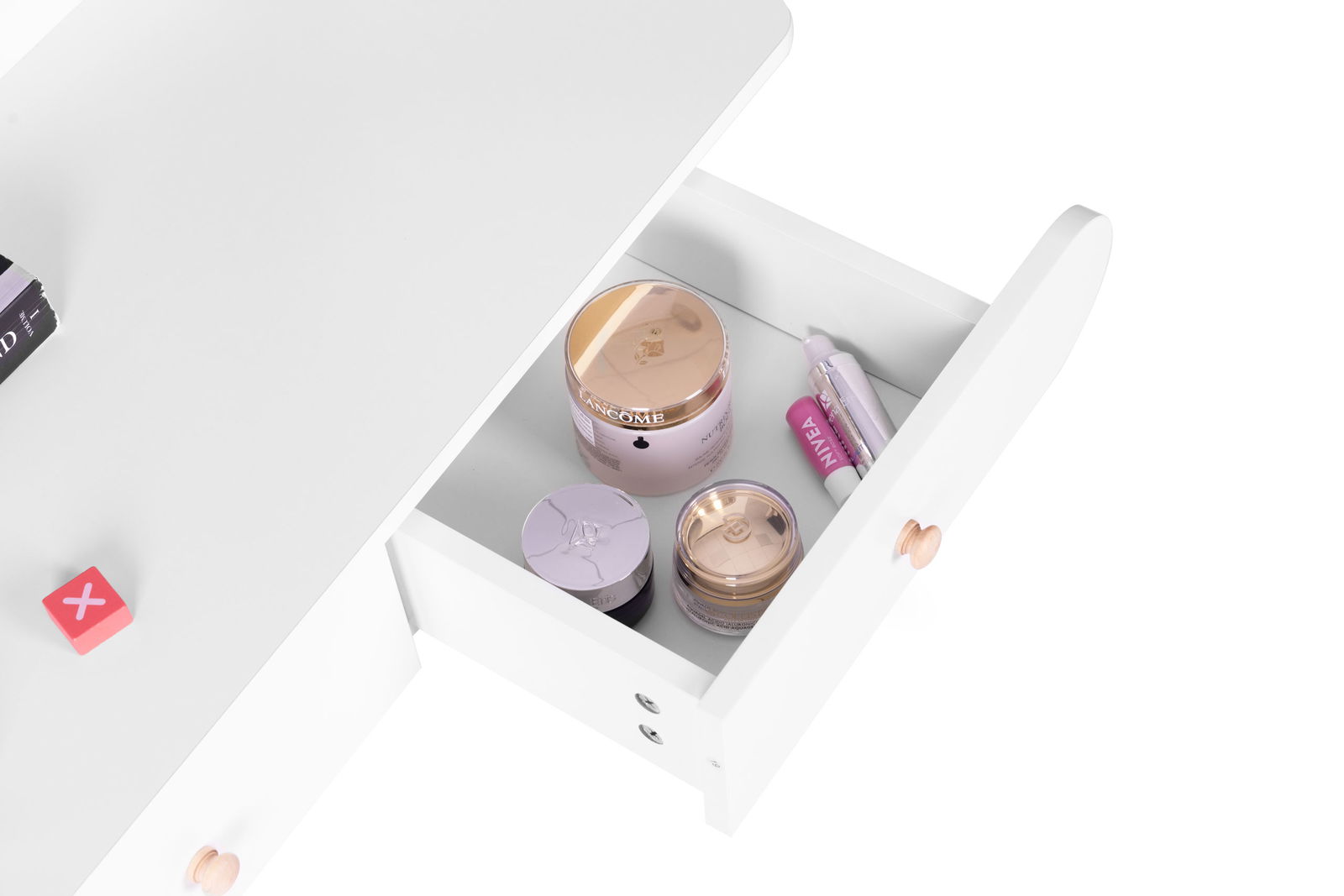 - Praktyczne szuflady - toaletka posiada dwie duże, wysuwane szuflady, które pomieszczą się wszystkie akcesoria potrzebne do codziennego makijażu.
