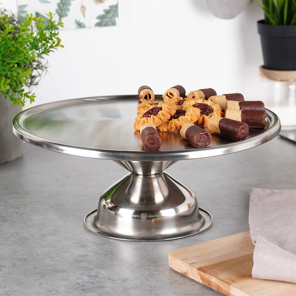 Patera na nóżce idealna na tort, ciasto lub inne słodkości. Posiada piękny, srebrny kolor, więc prezentuje się bardzo oryginalnie. Dzięki niej wyeksponujemy przygotowane słodkości. Klasyczny kształt sprawia, że dobrze komponuje się z pozostałą zastawą stołową. Łatwa w czyszczeniu i użytkowaniu.