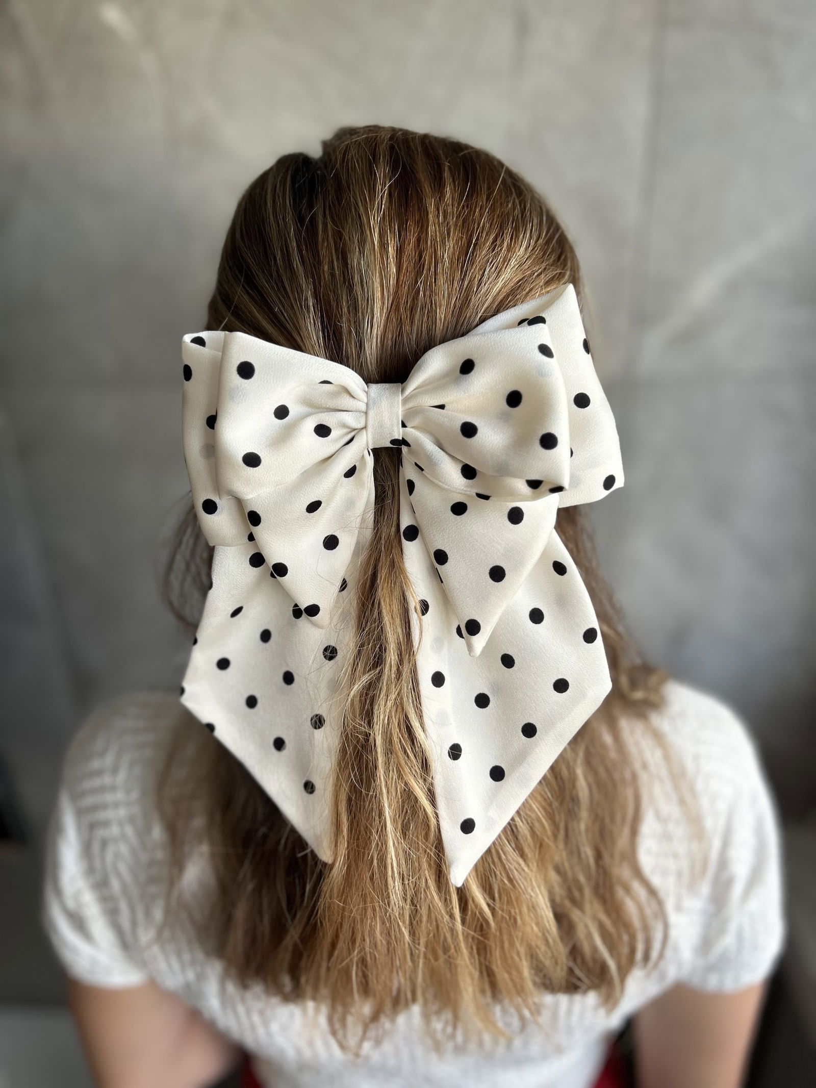 Piękna SATYNOWA KOKARDA DO WŁOSÓW NA SPINCE w kolorach: perła, czarny, brzoskwinia, lilia, bordo i perłowa w czarne kropki. Wybierz jakość i unikatowość — wybierz nasze produkty hand made.