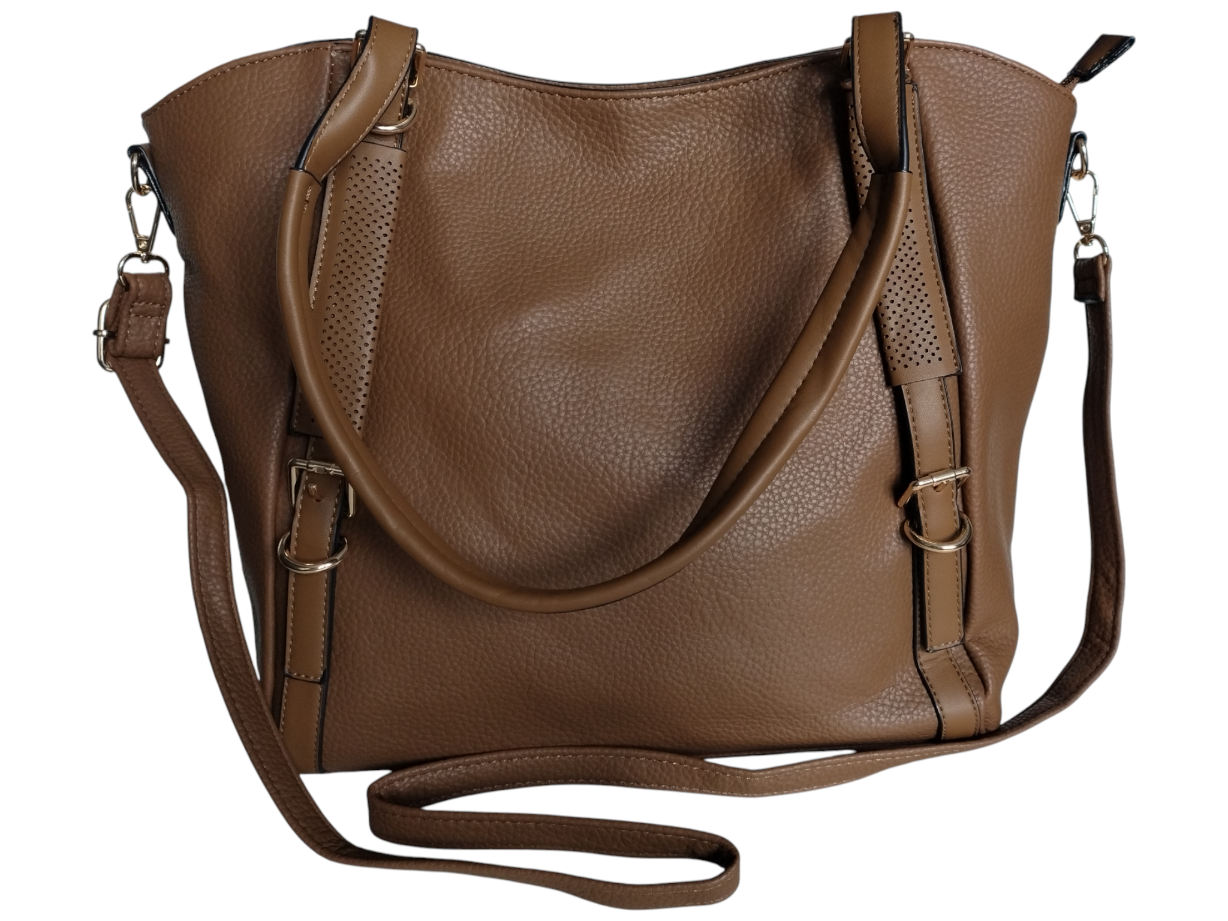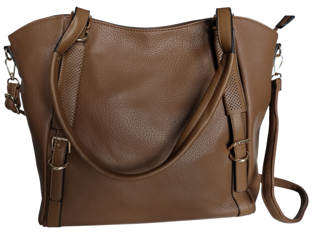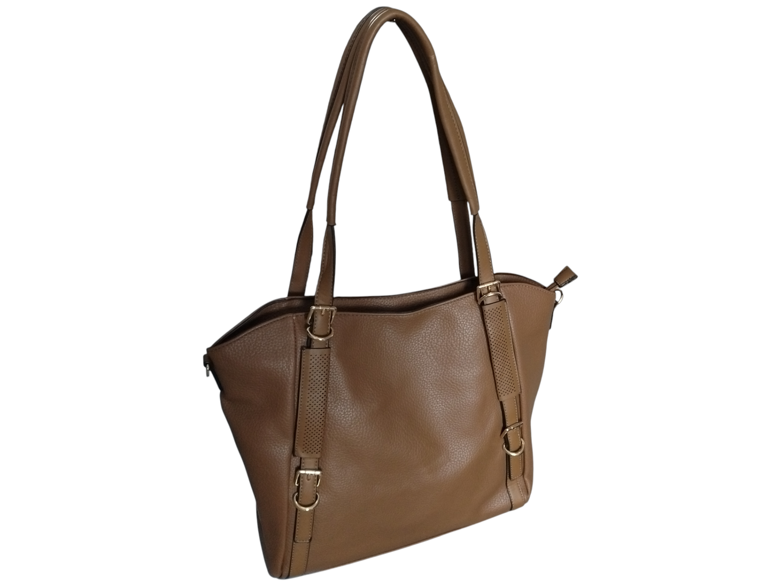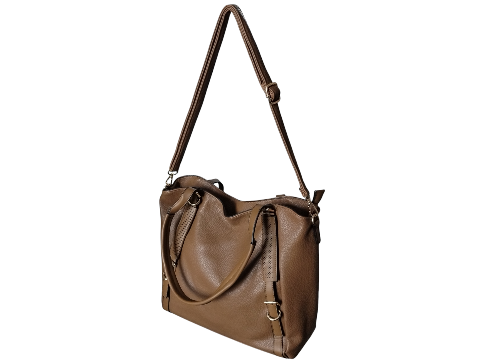 Duża Shopperka Damska, Miejska, Eko Skóra Groszkowa Brąz Camel Złote Okucia