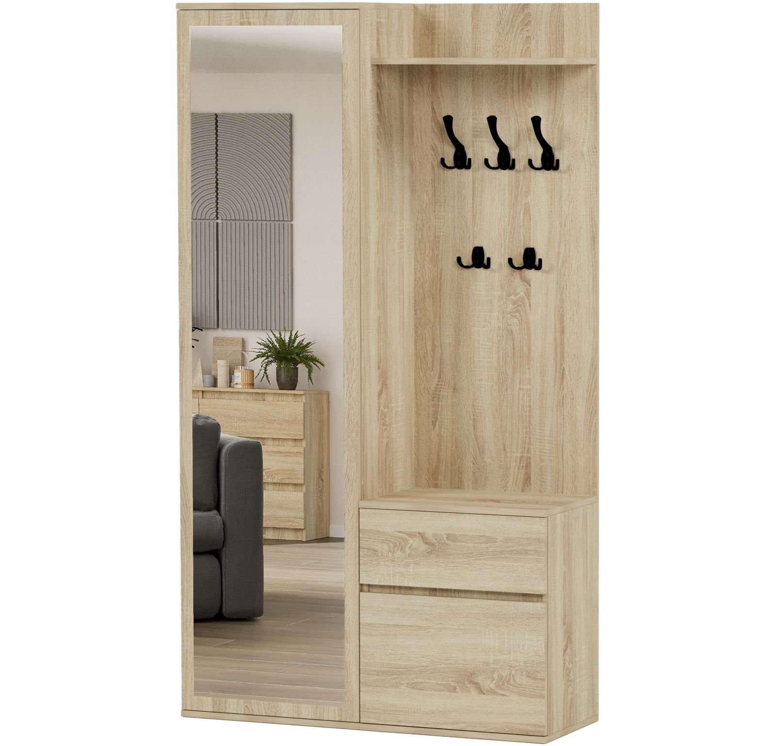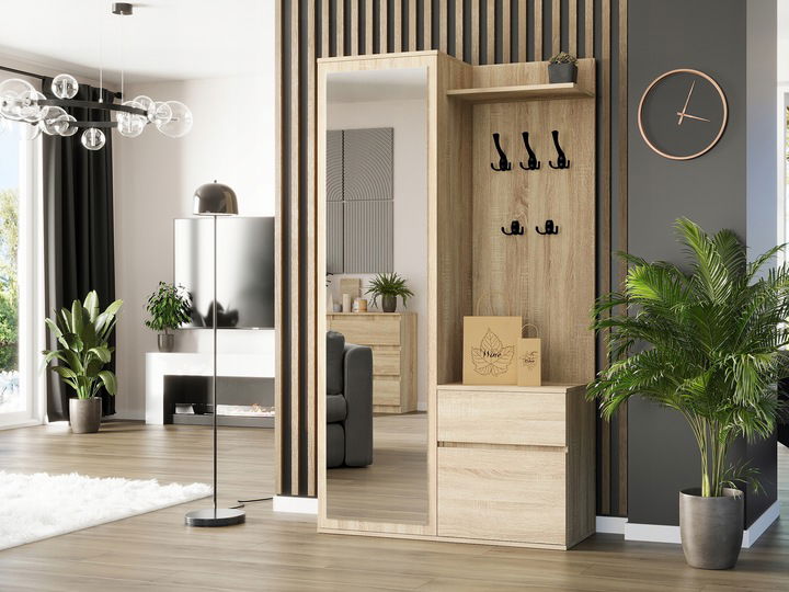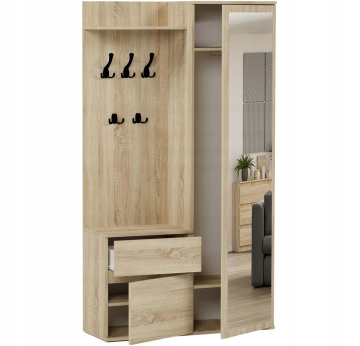 - Praktyczne przechowywanie: Szafka zaprojektowana z myślą o przechowywaniu obuwia, wyposażona w półki, szufladę oraz dodatkowe wieszaki.
