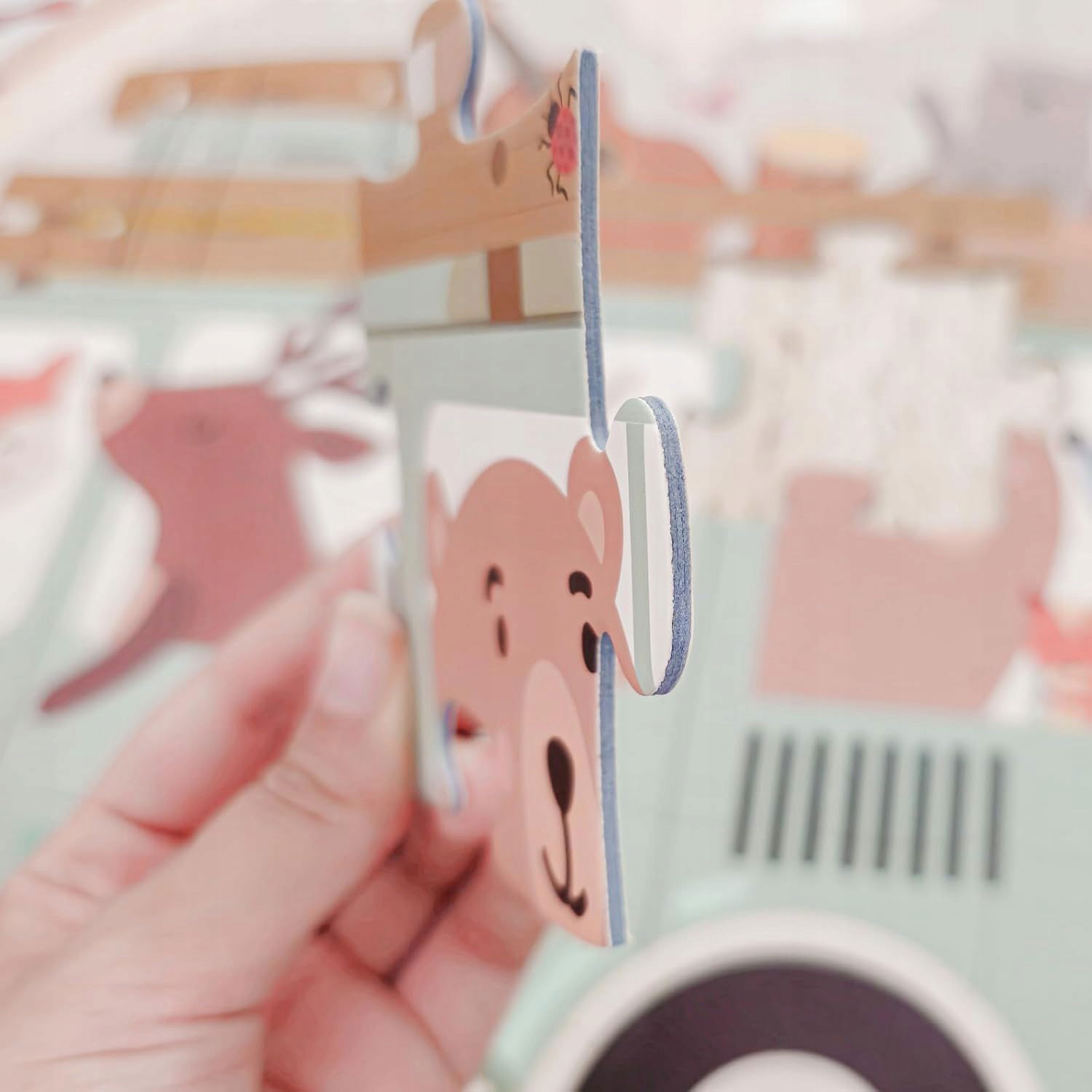 Puzzle przedstawiają kolorową furgonetkę pełną zwierząt: jeża, lisa, jelenia, zająca, niedźwiedzia, wiewiórkę, borsuka i kota ? – każdy z nich zabrał swój instrument muzyczny ??.