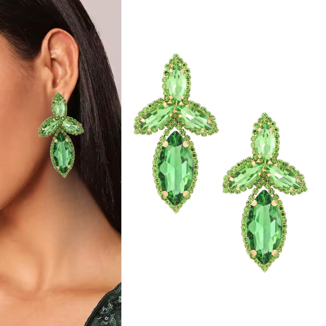 Duże kolczyki krótkie złote jasne zielone cyrkonie płatki kryształy