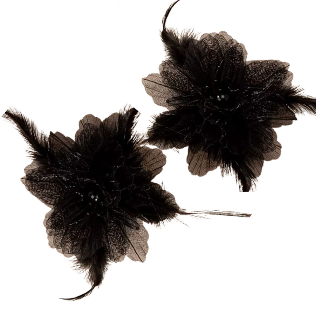 Okazałe i widowiskowe wręcz kolczyki z motywem dużego czarnego kwiatka 3d z pojedynczo wystającymi smukłymi piórami z pewnością będą odpowiednie do ciekawej i nietuzinkowej stylizacji, lub scenicznego wizerunku.