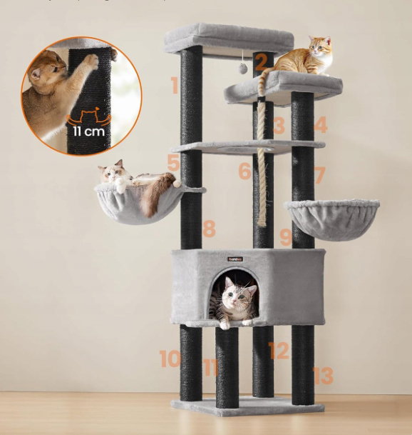 - ✴️ 13 grubych słupków (o średnicy 11 cm) owiniętych sizalem oferuje kotom przestrzeń do ostrzenia pazurów i wyżycia się. Dzięki temu Twoja sofa będzie chroniona przed pazurami.