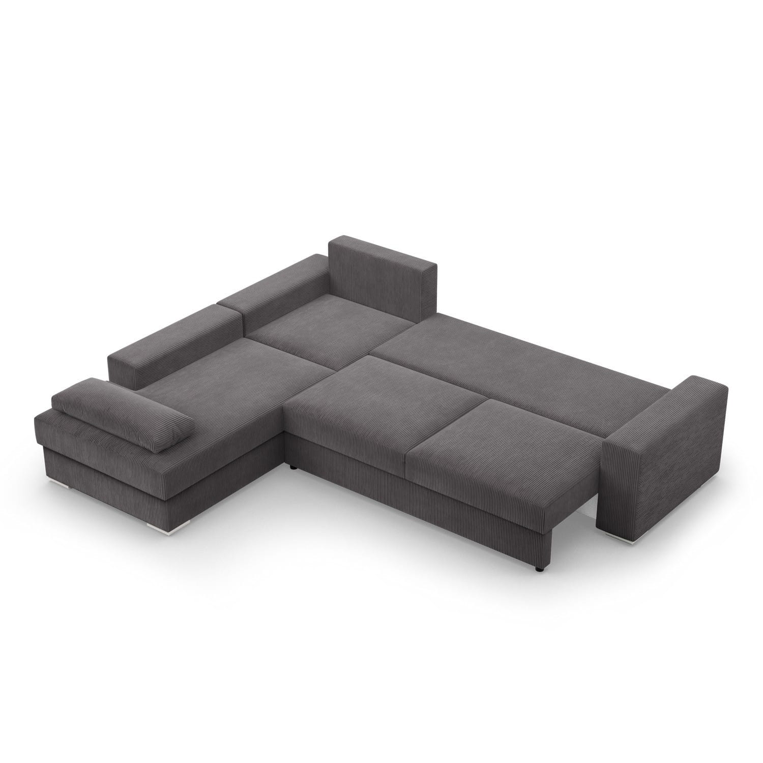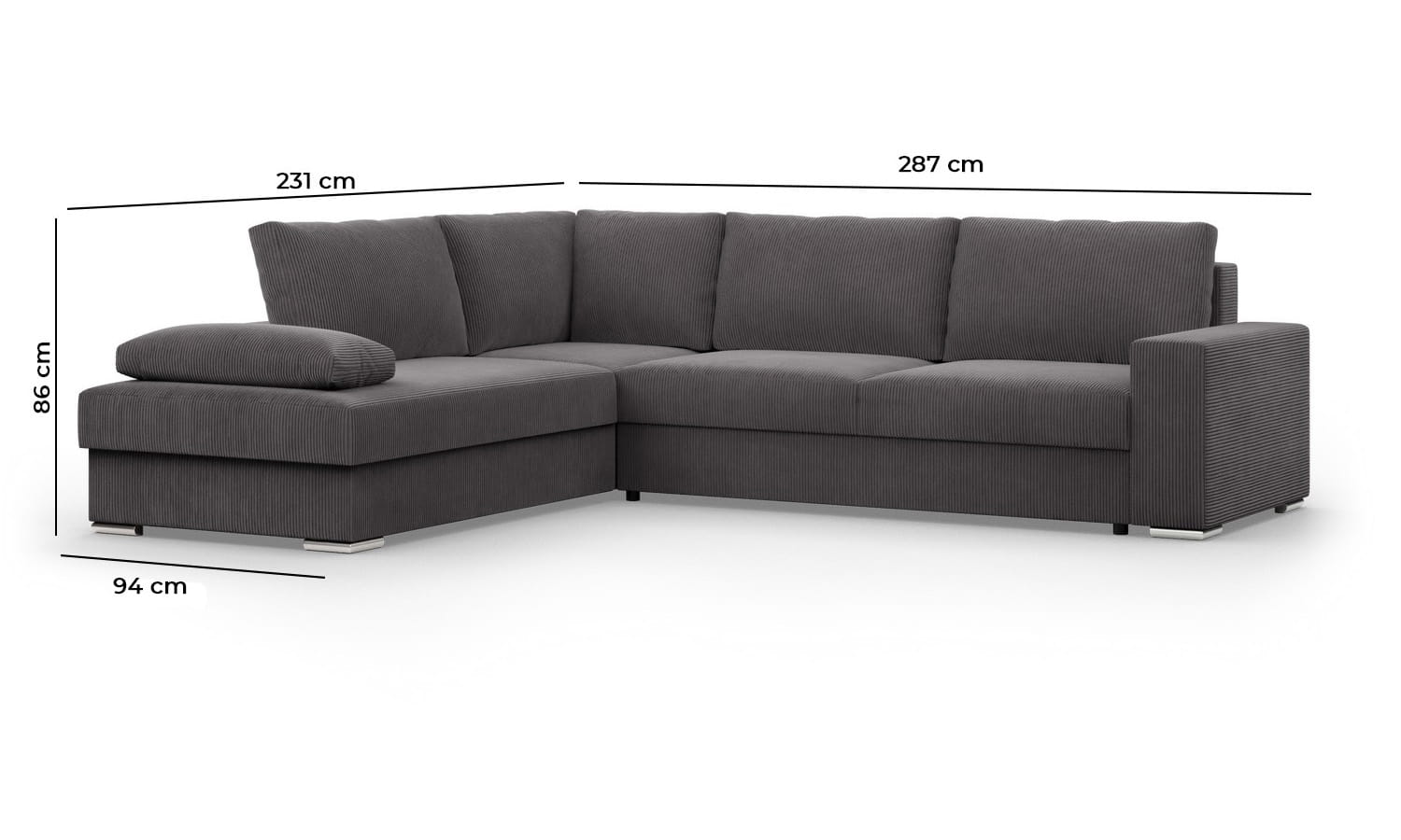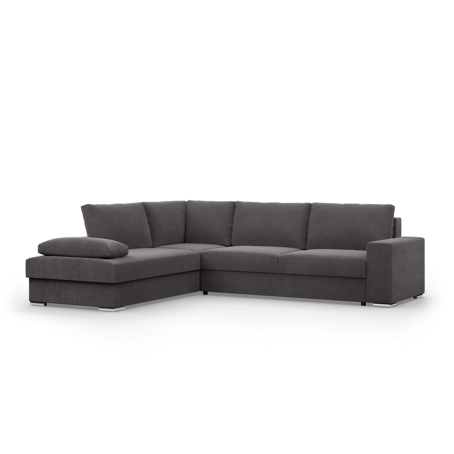 Duży narożnik, Momento, lewy, sztruks, 287x231x86 cm, ciemny szary. Narożnik MOMENTO to mebel, który urzeka swoim wyglądem i funkcjonalnością. Wykonany z miękkiego i przyjemnego w dotyku sztruksu, w kształcie litery L, idealnie odnajdzie się w dużych przestrzeniach, stając się centralnym punktem każdej aranżacji.