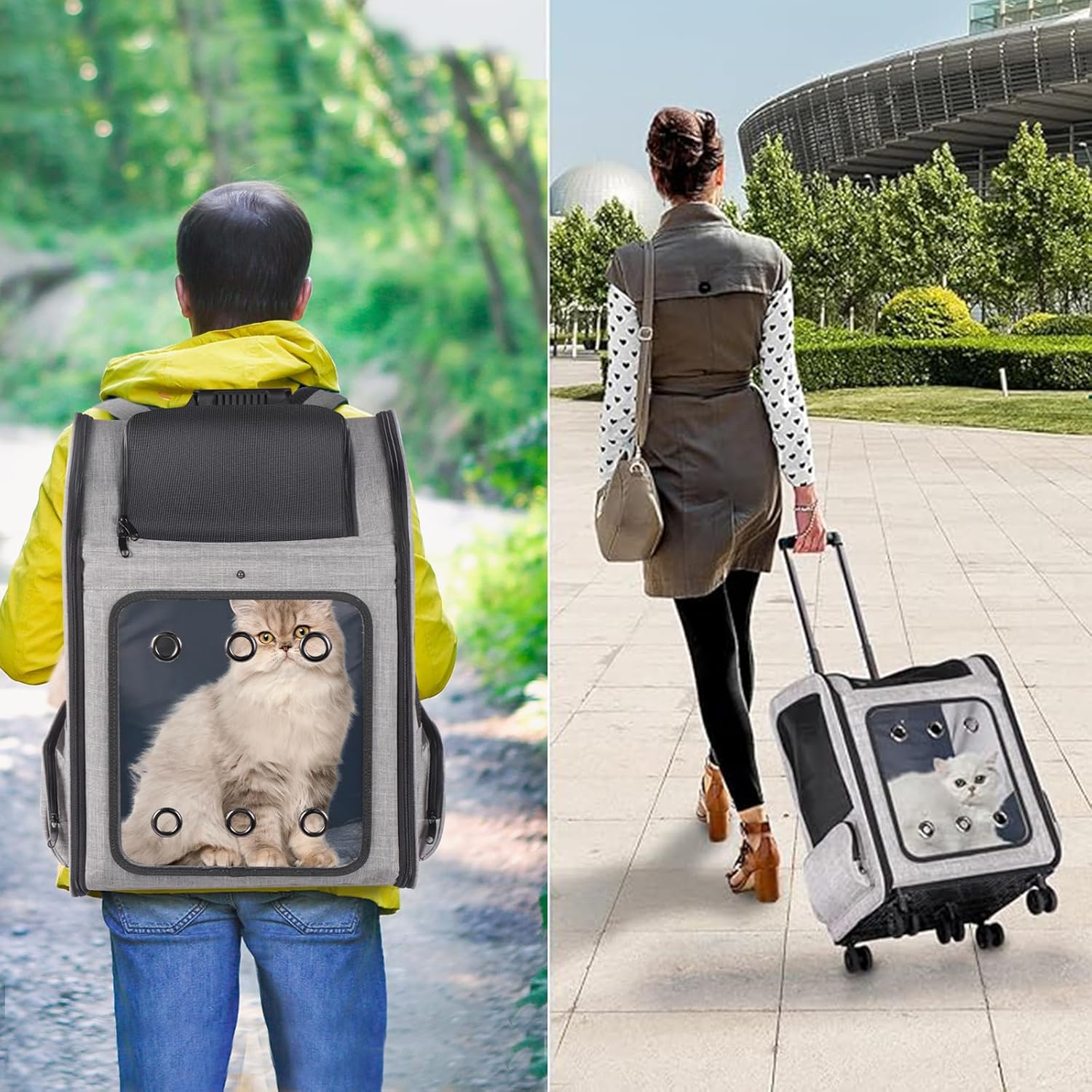 - Zastosowanie: plecak służy do bezpiecznego i wygodnego transportu zwierząt domowych, takich jak duże koty oraz małe psy, zarówno na plecach, jak i na kółkach.
