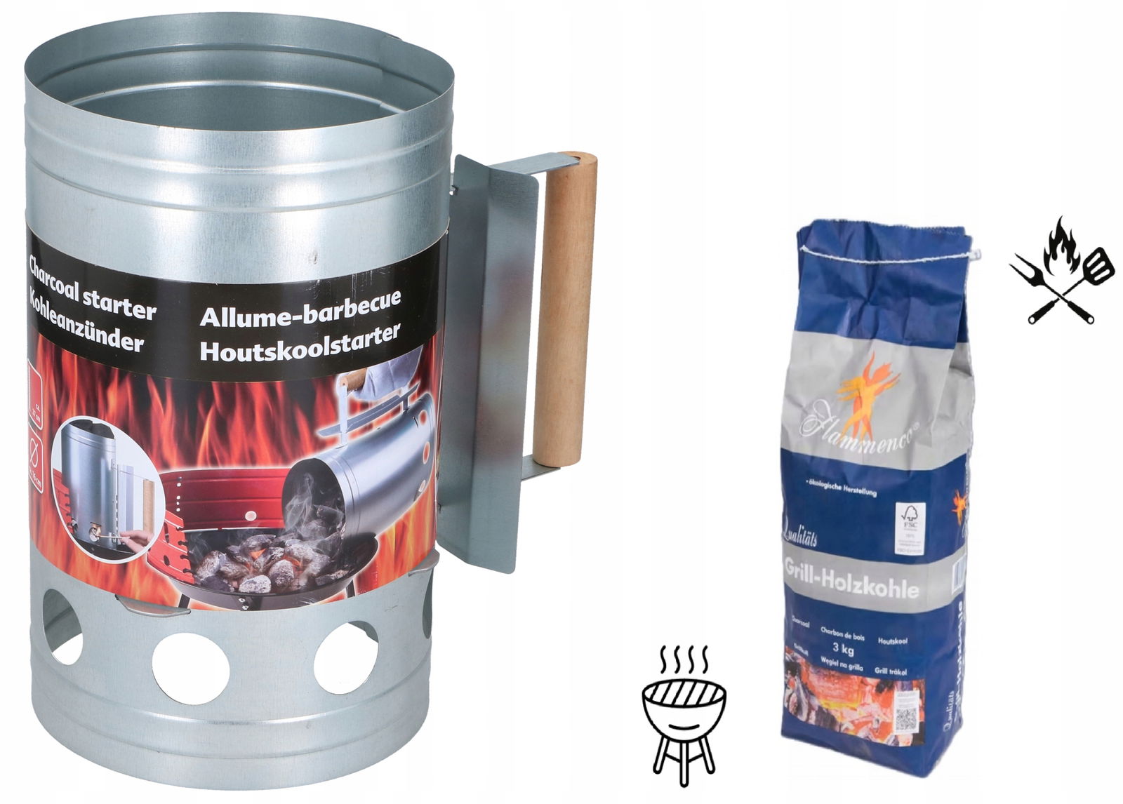 DUŻY SREBRNY GRILL KOMIN DO ROZPALANIA GRILLA + WĘGIEL DRZEWNY WOREK 3KG