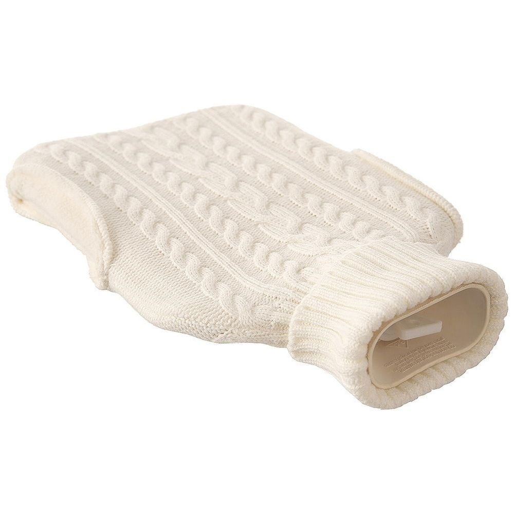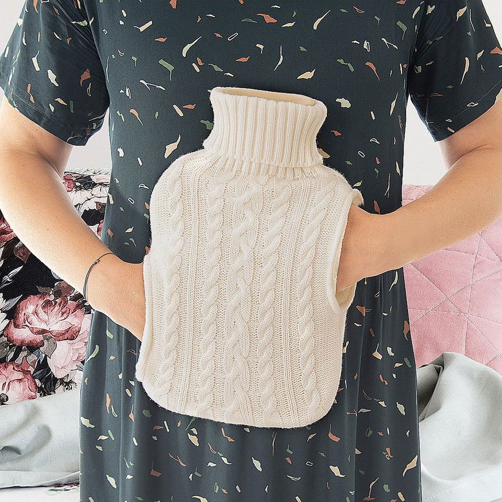 PRZYDATNY - Termofor gumowy w sweterkowym pokrowcu w kolorze beżowym. Ogrzeje zimne łóżko lub wybrane części ciała. Termofor ma pojemność 1,6 litra (napełniamy go wodą) i wymiary 33 x 20 cm.