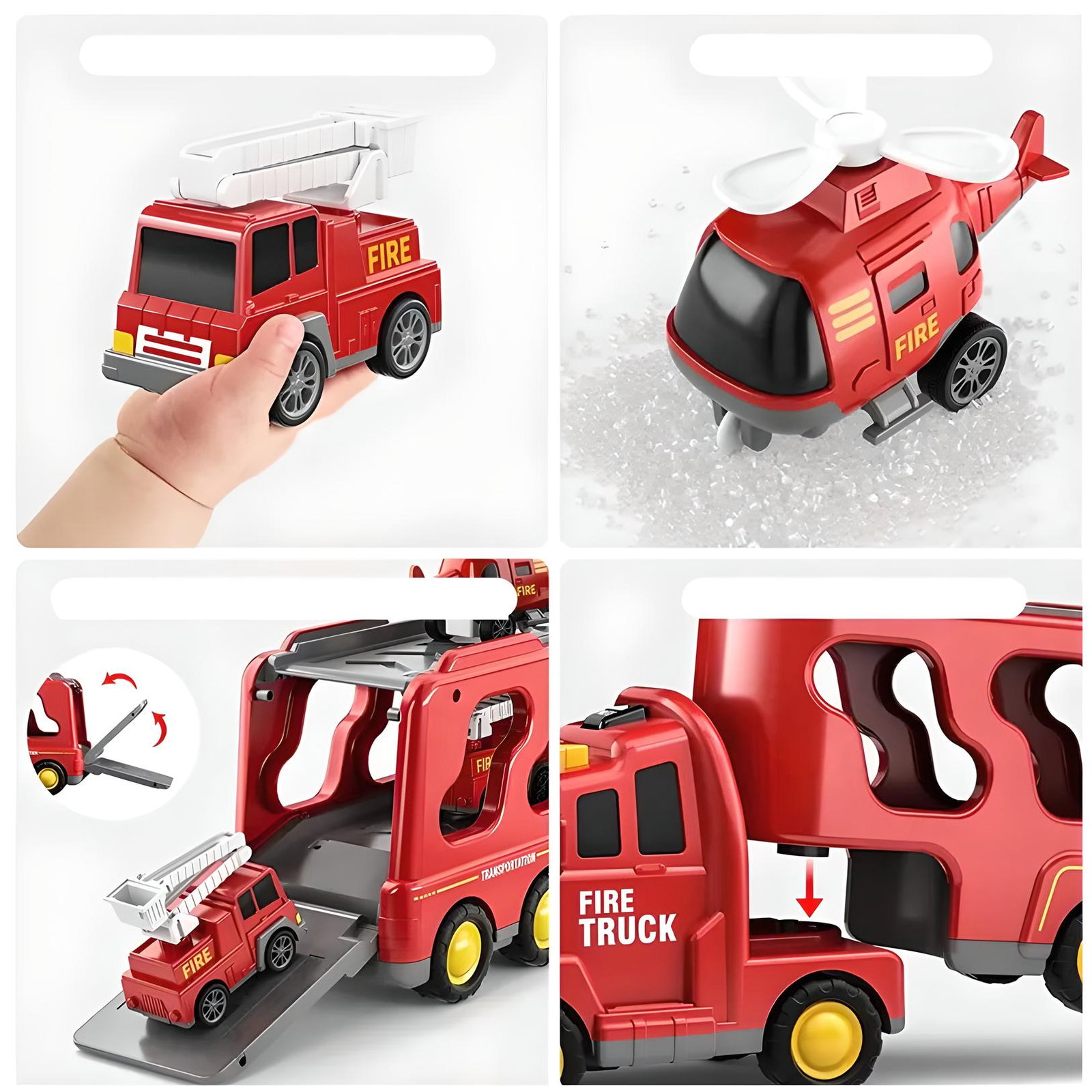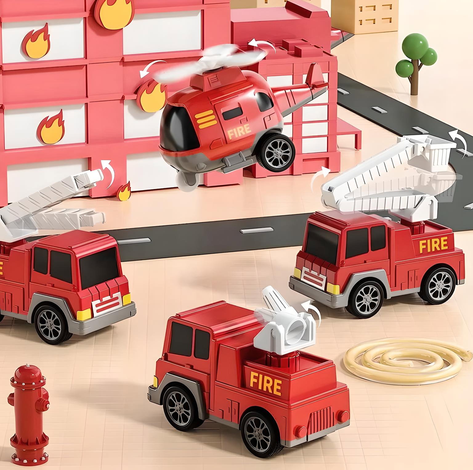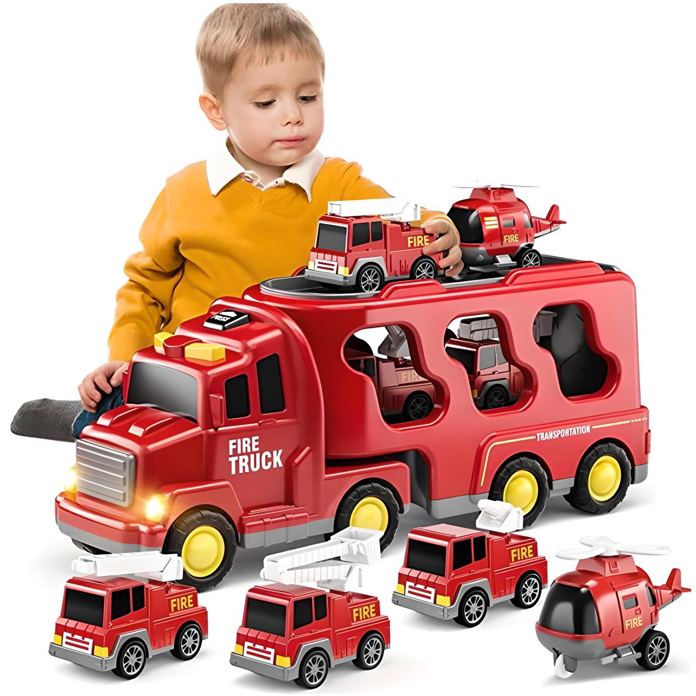 ✅Zabawki w postaci ciężarówek - przeznaczone dla entuzjastów małych strażaków, zawierają większy pojazd transportowy i 4 małych samochodów (samochód strażacki, ciężarówka z drabiną, helikopter i ciężarówka zraszająca).
