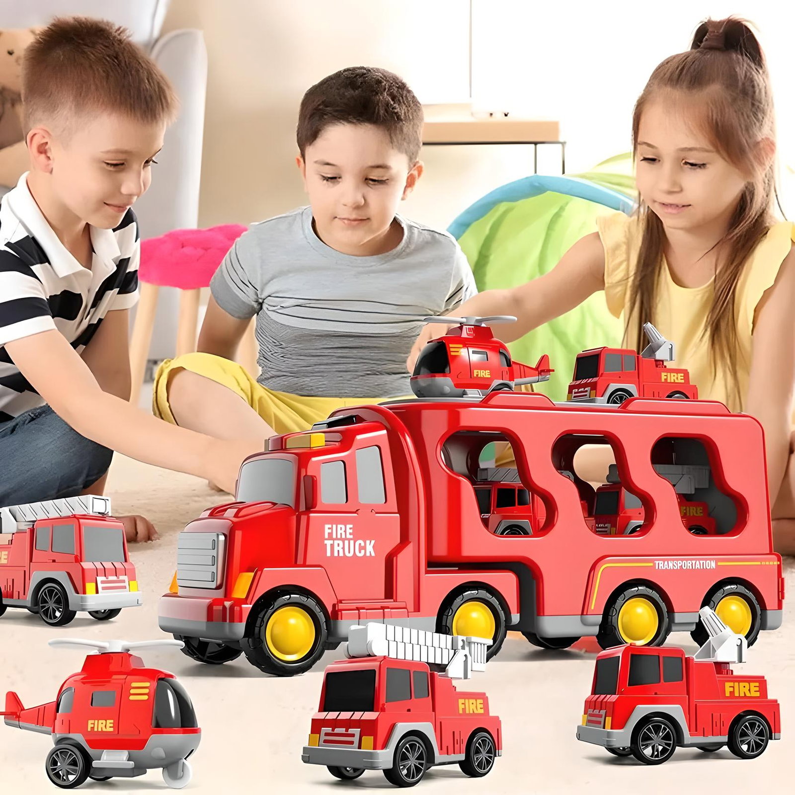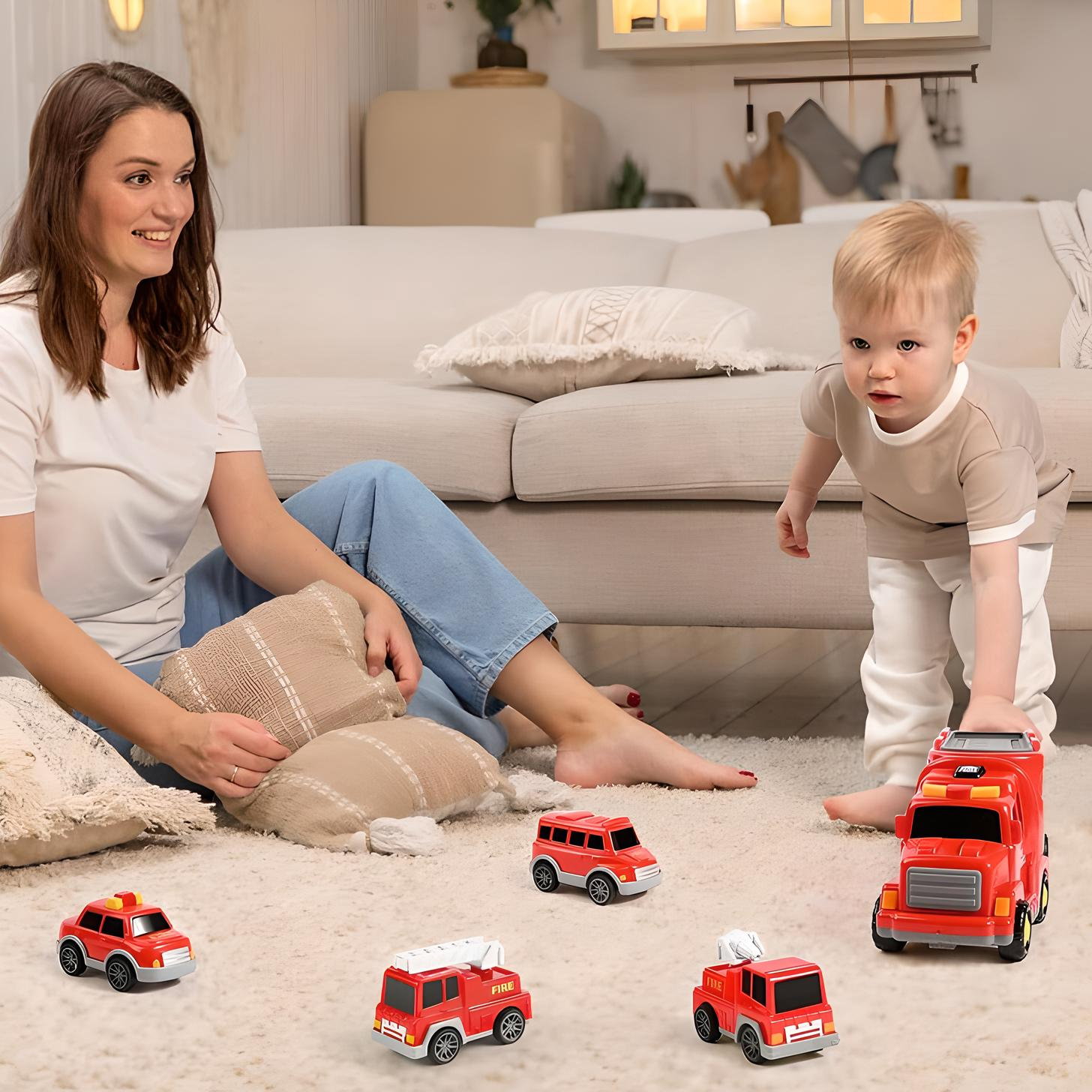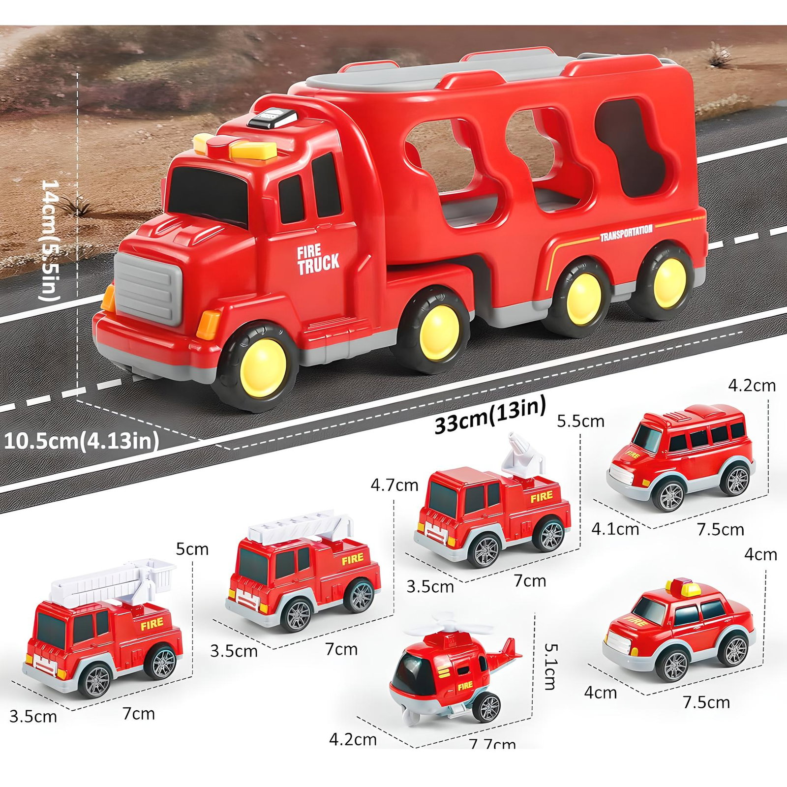 ✅Zabawki w postaci ciężarówek - przeznaczone dla entuzjastów małych strażaków, zawierają większy pojazd transportowy i 4 małych samochodów (samochód strażacki, ciężarówka z drabiną, helikopter i ciężarówka zraszająca).