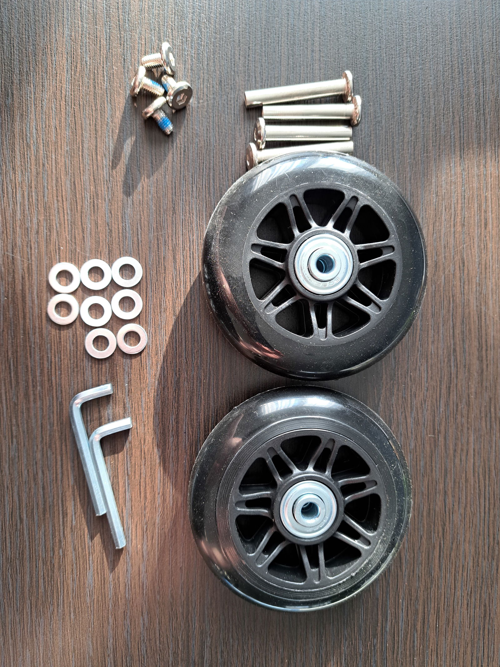 Dwa kółka zamienne do walizki bagażowej.