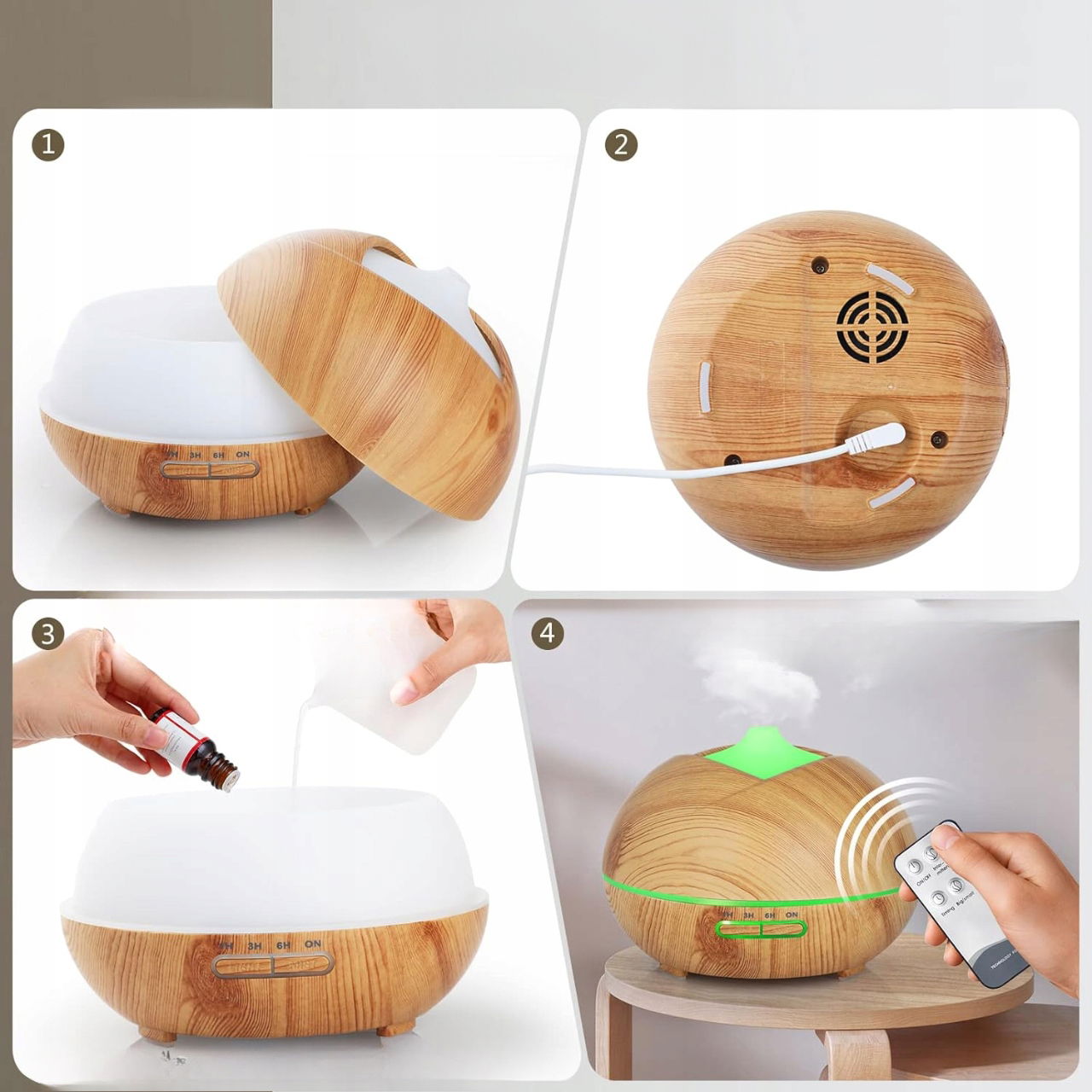 Wprowadź do swojego domu atmosferę relaksu i odprężenia dzięki dyfuzorowi olejków eterycznych Bigqin 500 ml. Urządzenie łączy w sobie funkcję nawilżacza powietrza oraz aromaterapeutycznego dyfuzora zapachowego, zapewniając przyjemny zapach i odpowiedni poziom wilgotności. Jego elegancki design z efektem naturalnego drewna idealnie komponuje się z każdym wnętrzem – od salonu po gabinet spa.