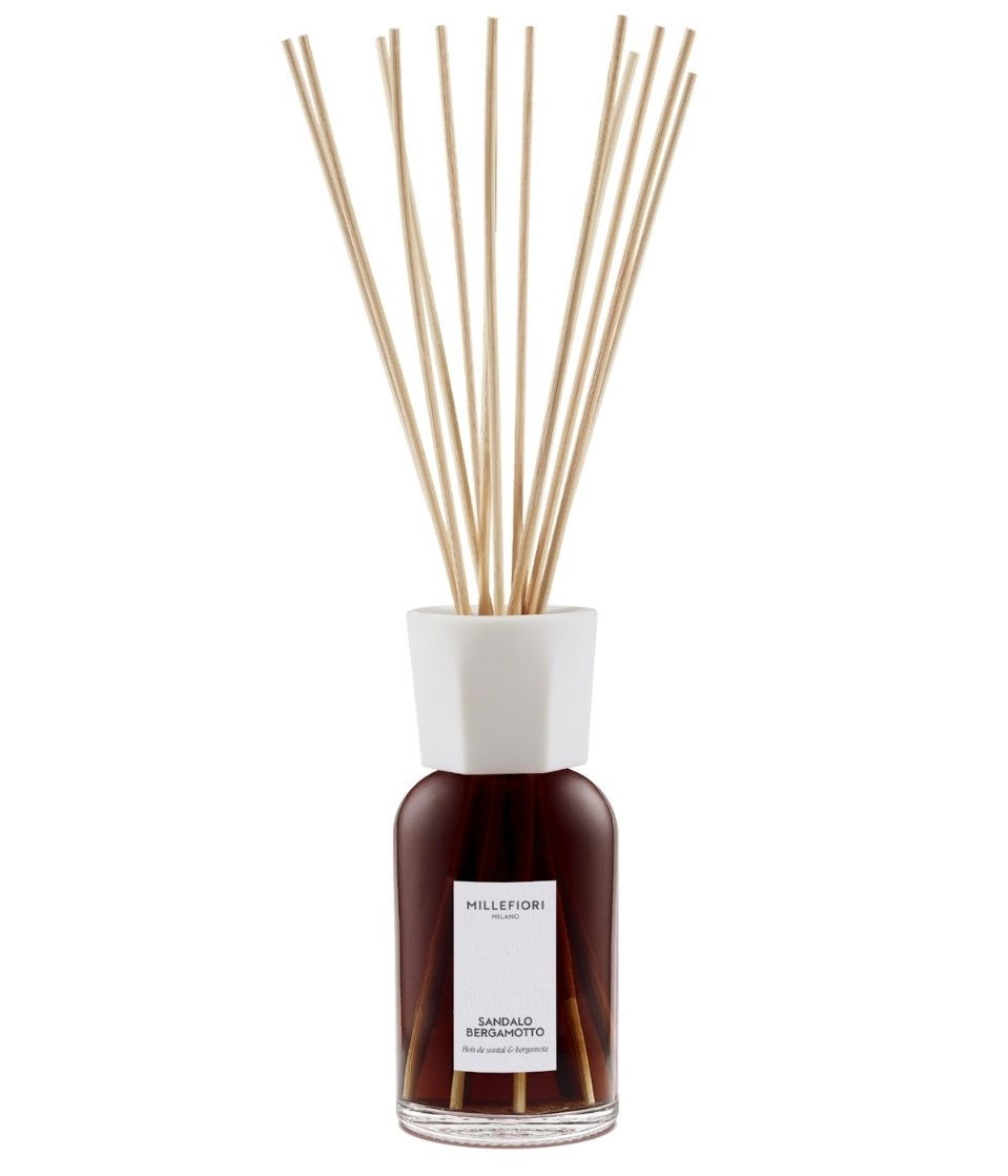 Duży dyfuzor z patyczkami rattanowymi marki Millefiori MILANO o zapachu SANDALO BERGAMOTTO. Drzewne aromaty sandałowca połączone z nutą cytrusów i lawendy doskonale sprawdzą się w salonie, sypialni czy biurze, dodając wnętrzu elegancji i świeżości.