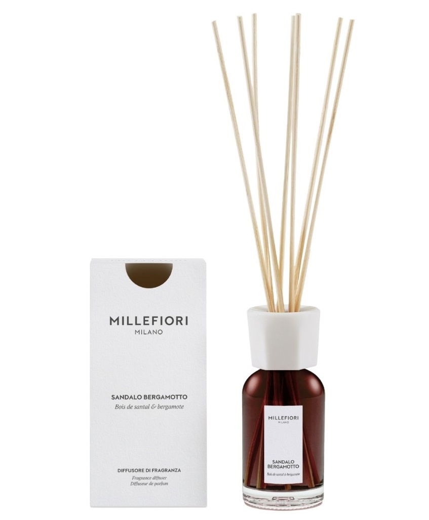 Dyfuzor z patyczkami rattanowymi marki Millefiori MILANO o zapachu SANDALO BERGAMOTTO. Drzewne aromaty sandałowca połączone z nutą cytrusów i lawendy doskonale sprawdzą się w salonie, sypialni czy biurze, dodając wnętrzu elegancji i świeżości.