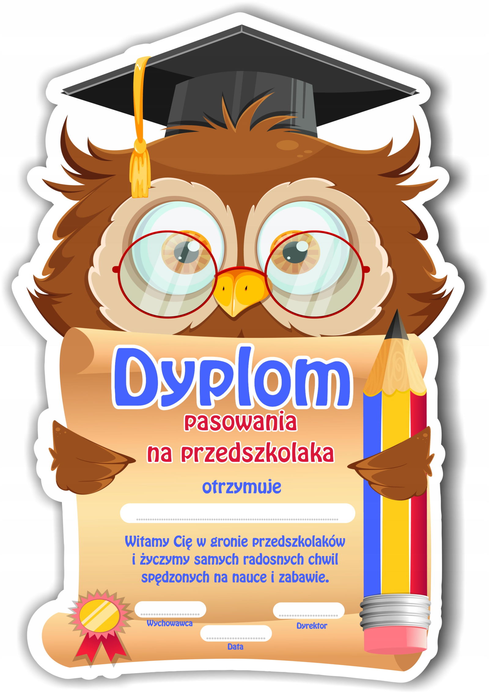 Starannie wykonany dyplom w  kształcie sowy na pewno zapadnie w pamięć, dzięki czemu będzie wyróżniał się na zakończeniu roku w przedszkolu.