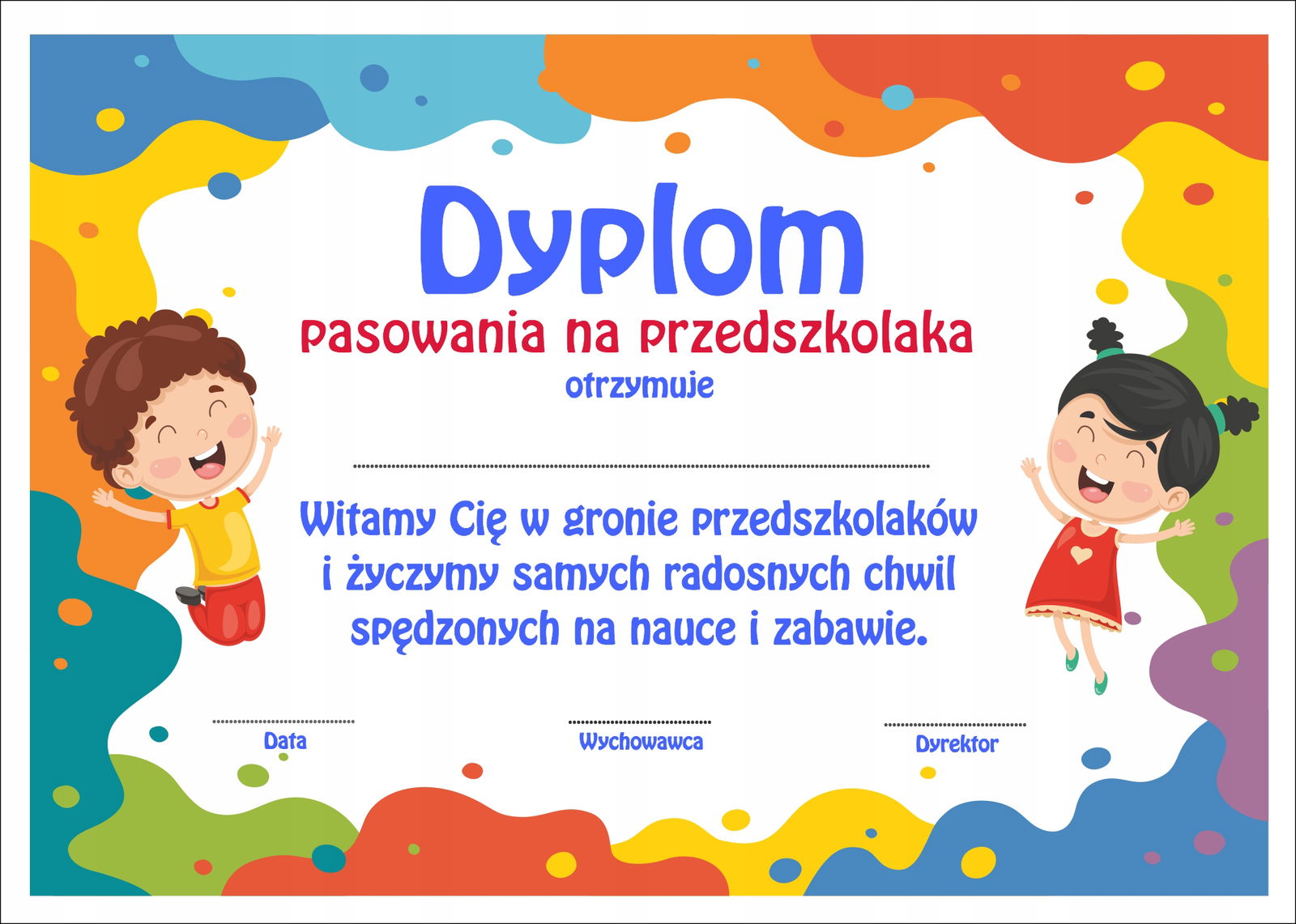 Starannie wykonany dyplom na pewno zapadnie w pamięć, dzięki czemu będzie wyróżniał się na zakończeniu roku w przedszkolu.