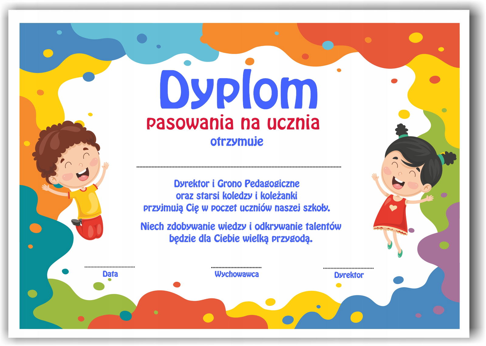 Będzie świetną pamiątką pasowania na  ucznia, rozmiar A4 sprawia, że dyplom jest bardzo poręczny.