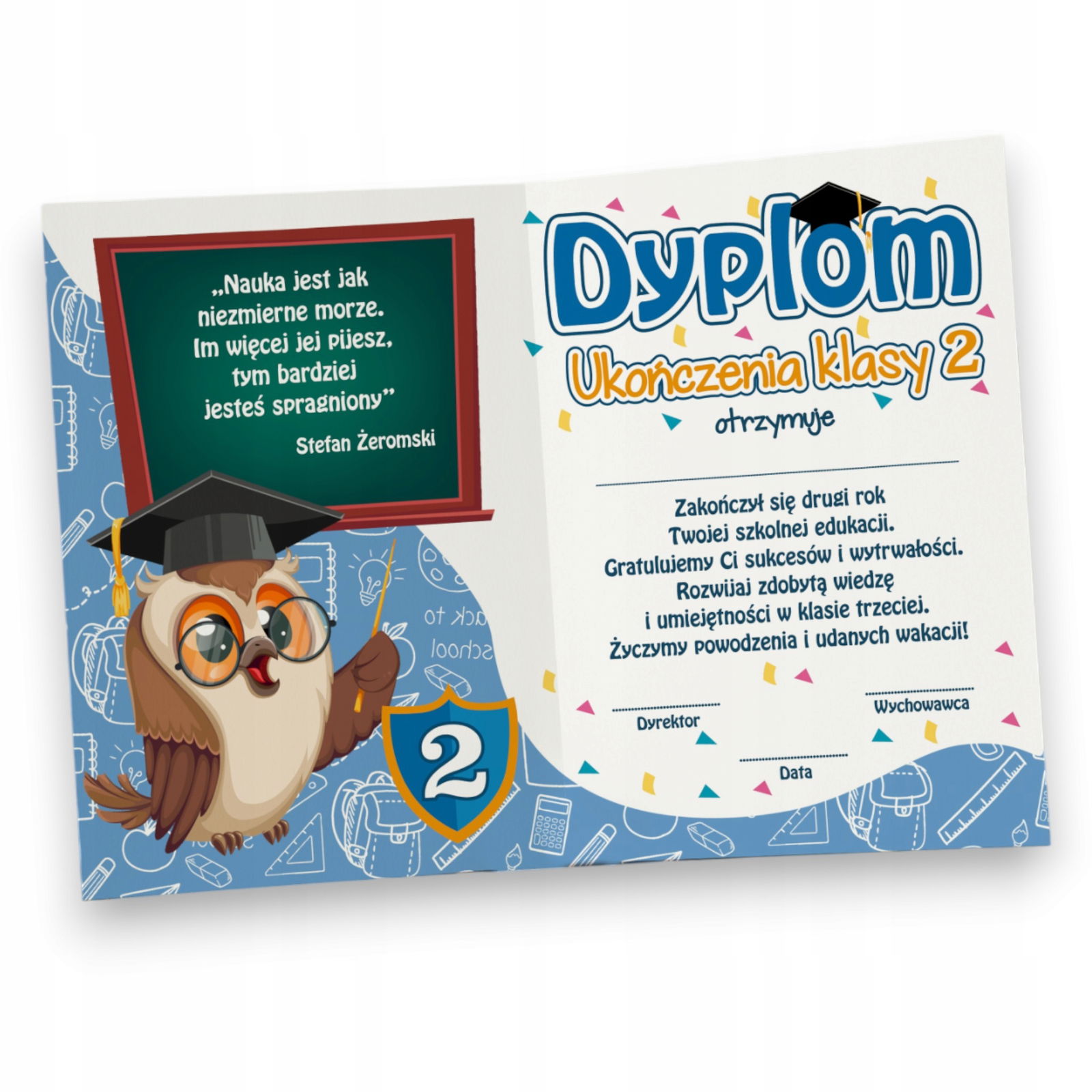 Dyplom składany ukończenia klasy 2 SOWA duży a5 ZAKOŃCZENIE ROKU