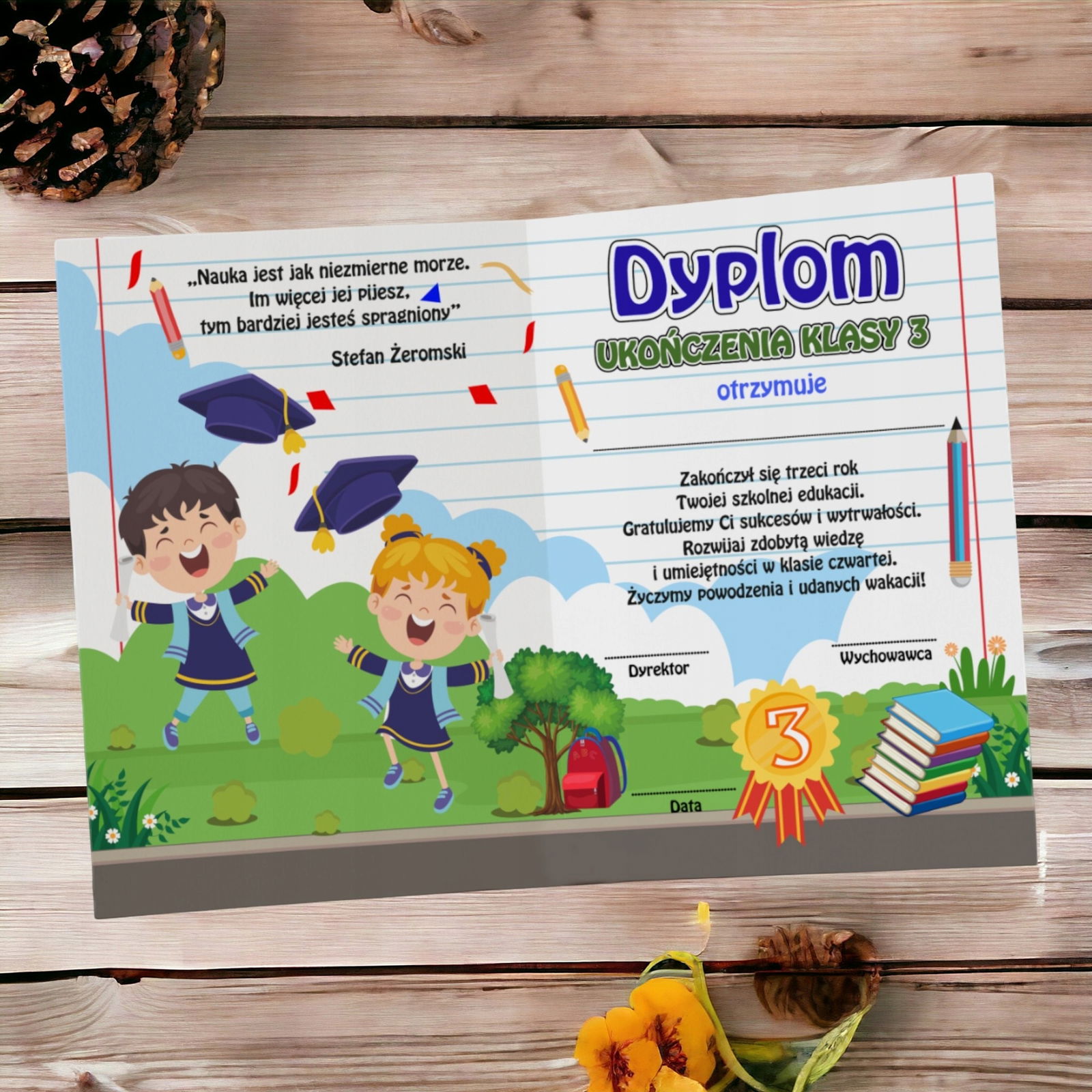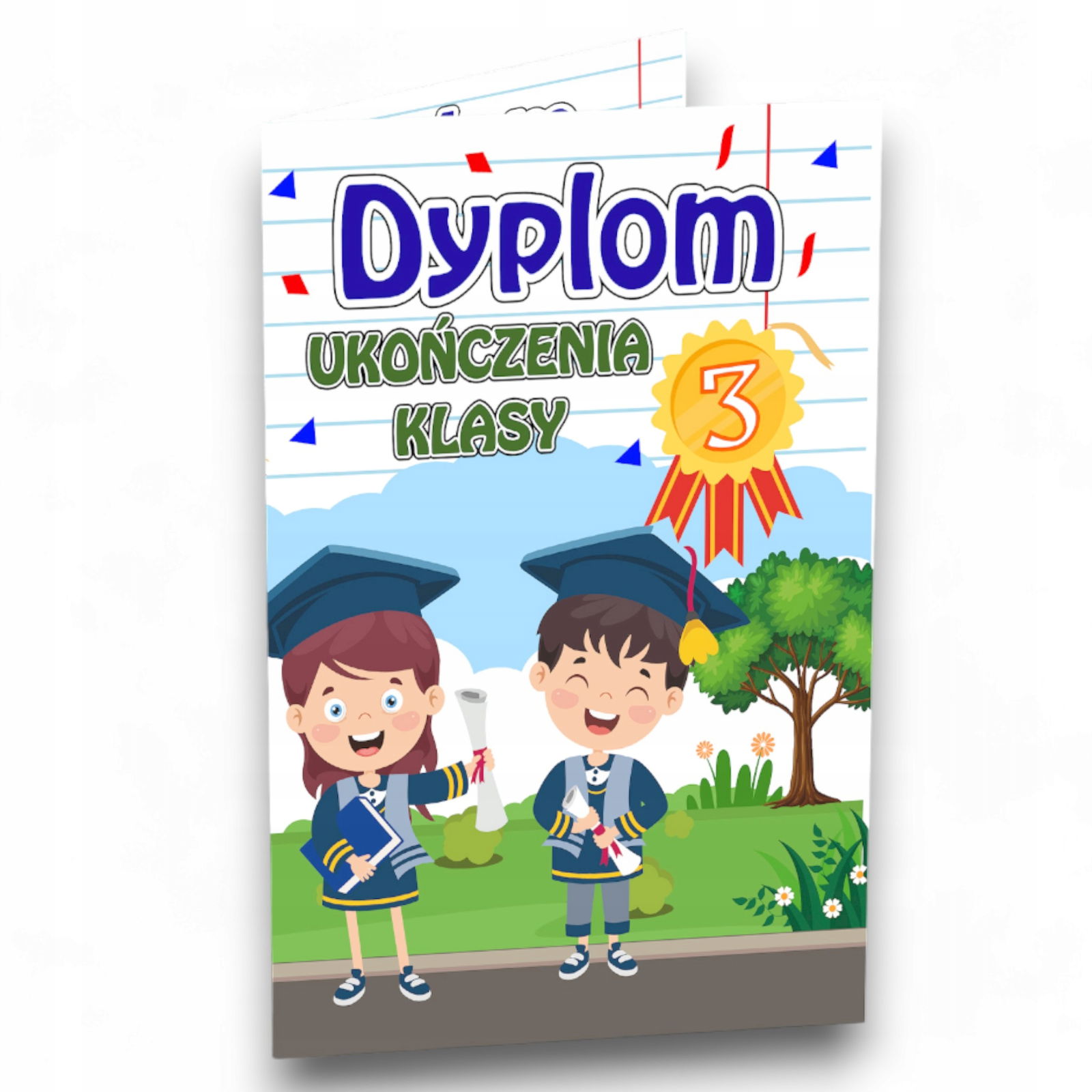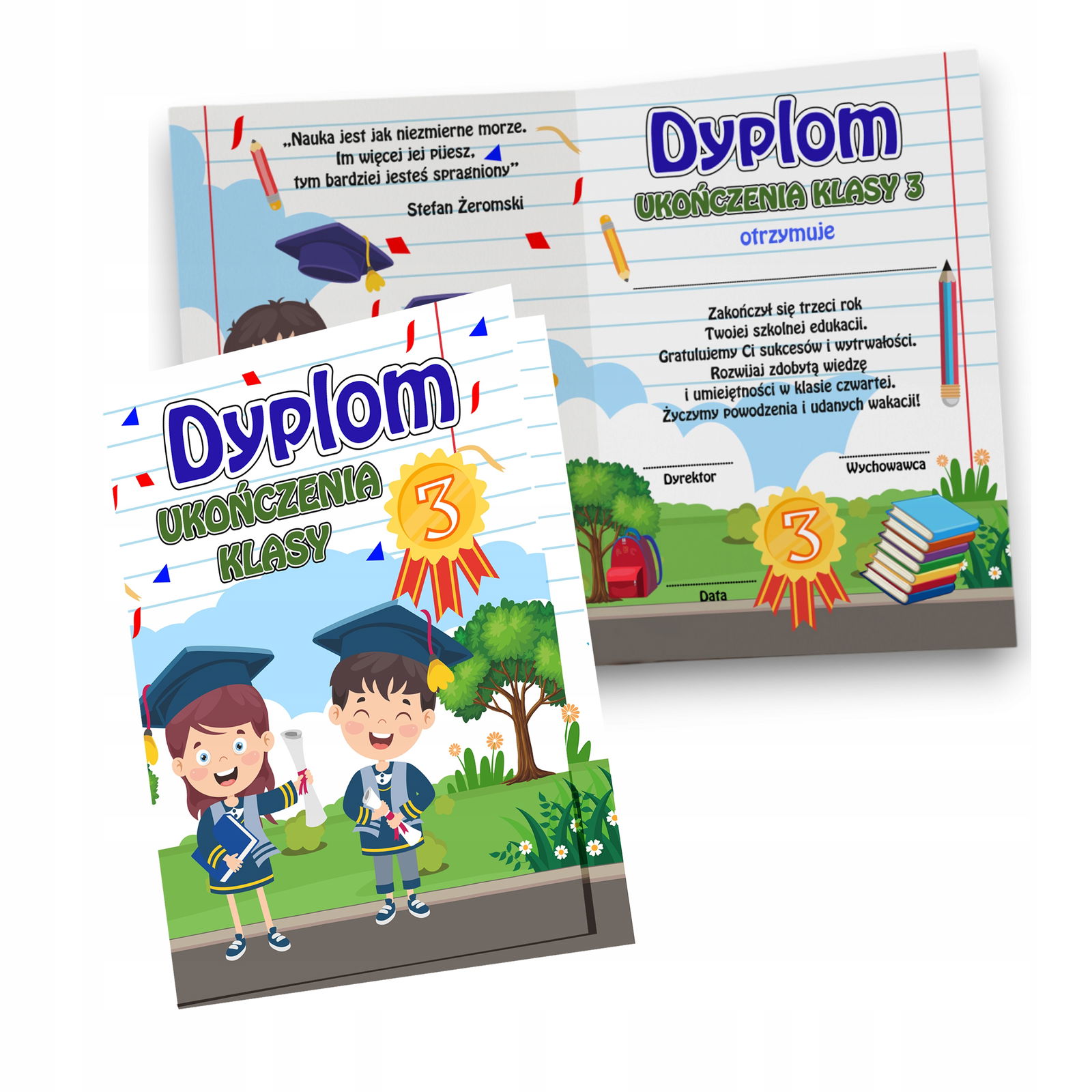 • zadrukowany dwustronnie w formie składanej książeczki będzie idealnym upominkiem dla dziecka z okazji Zakończenia Roku.