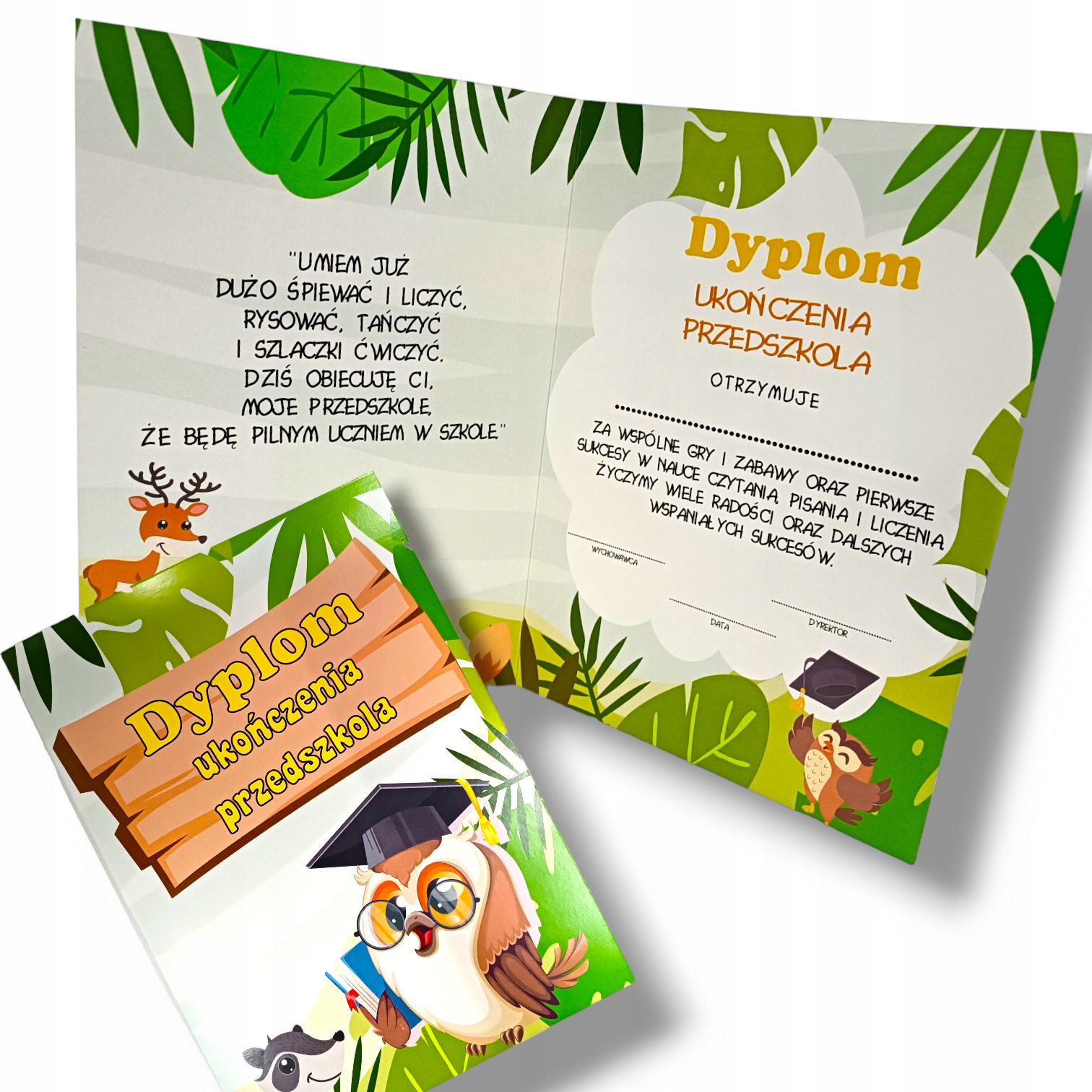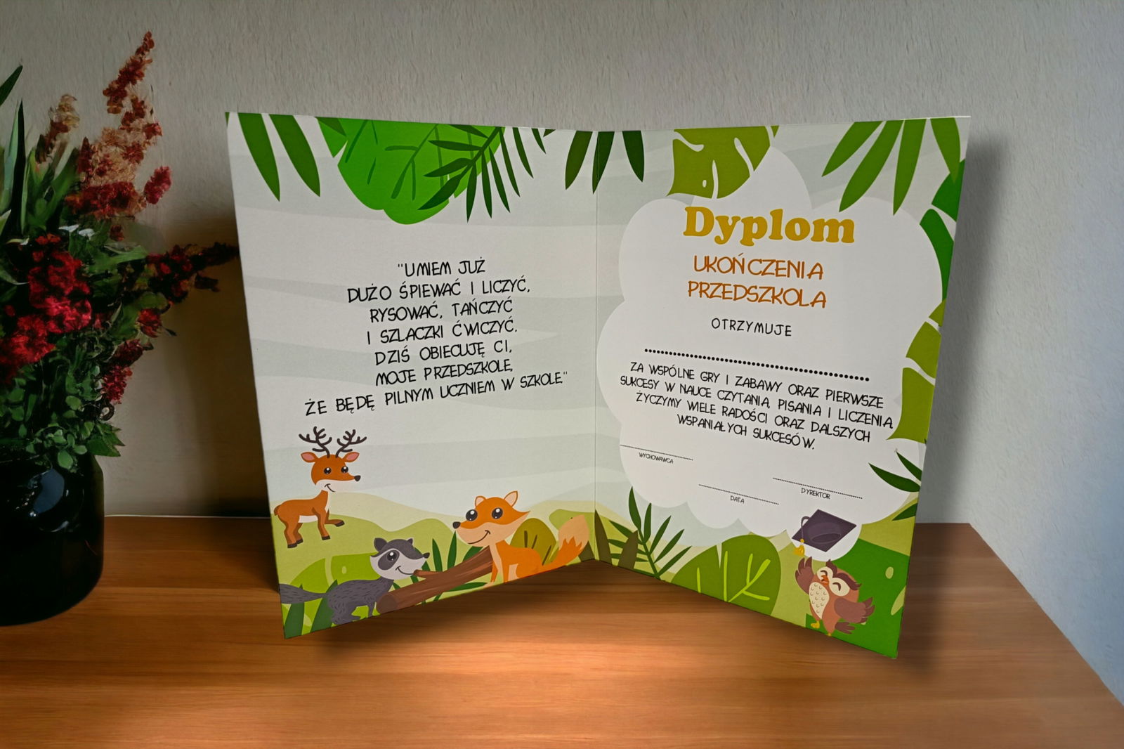 Starannie wykonany dyplom składany na pewno zapadnie w pamięć, dzięki czemu będzie wyróżniał się na zakończeniu roku w przedszkolu.