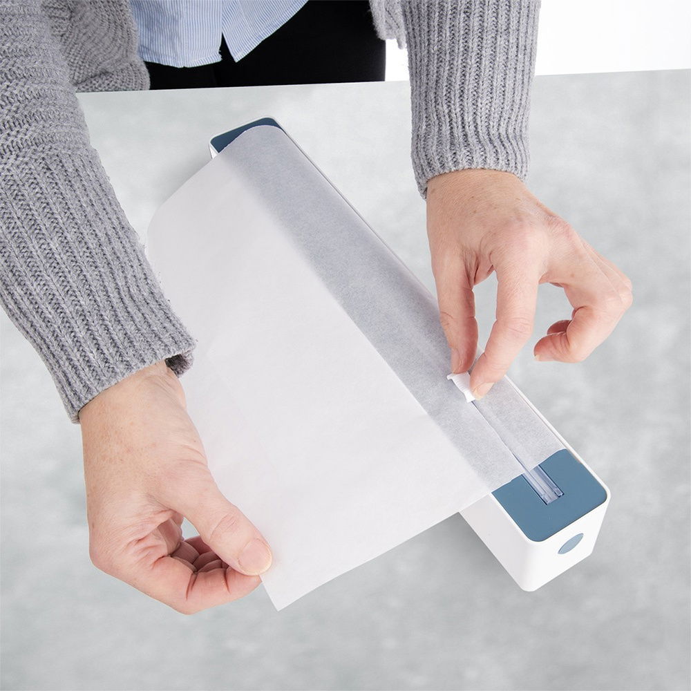 Prosta instalacja i wymiana rolki - Wystarczy nacisnąć boczne zatrzaski, otworzyć pojemnik i umieścić rolkę na zaczepach. Folia przechodzi przez wycięcie, a po zamknięciu wieczka jest gotowa do cięcia.