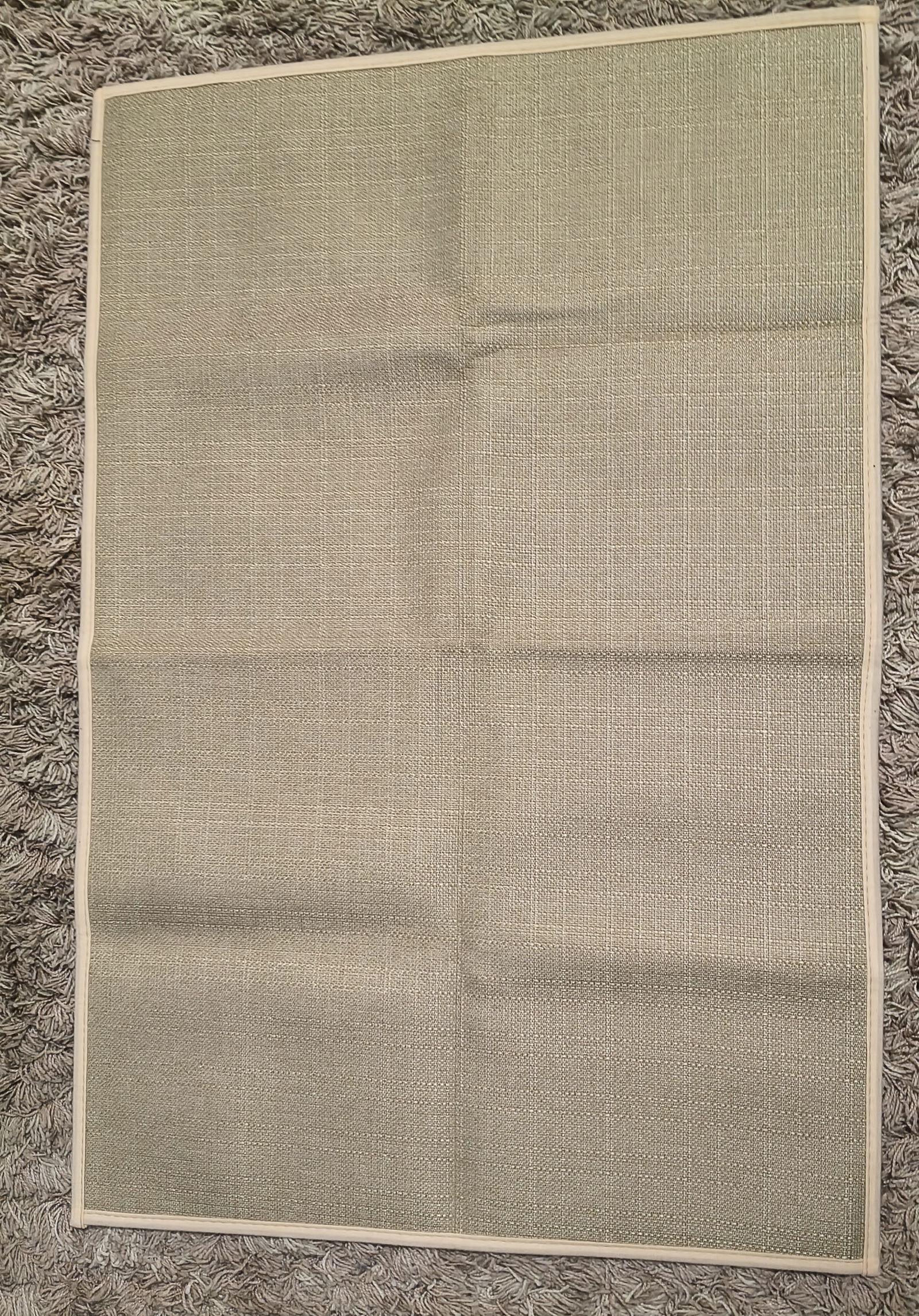 Dywan lniany 90x60 cm. Na spodzie podgumowanie (antypoślizg), brzegi wykończone bawełnianą lamówką. Nadaje się do kuchni, przedpokoju lub pomieszczeń gospodarczych. Dywanik ma pomagazynowe zagniecenia, które powinny się rozprostować z czasem.