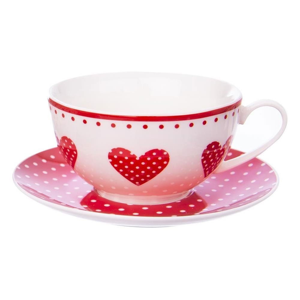 PORCELANOWY - Zestaw wykonany jest z wysokiej jakości porcelany w białym kolorze. Naczynia posiadają efektowne zdobienia w formie serc i kropek na powierzchni w czerwonym kolorze. Odpowiednio użytkowane posłużą długie lata.