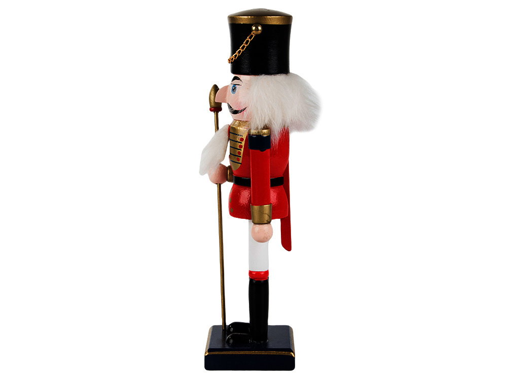 Dziadek do orzechów został wykonany z litego drewna, co gwarantuje trwałość i solidność tej dekoracji. Precyzyjnie wykonane detale oraz ręcznie malowane wykończenia sprawiają, że każdy egzemplarz jest unikalny. To prawdziwe rzemiosło, które będzie cieszyć oko przez wiele lat.