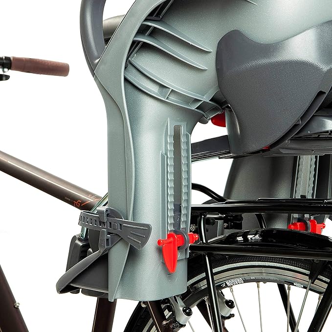 Wyrafinowane technicznie mocowanie automatycznie dopasowuje się do średnicy rury (w zakresie od 28 do 40 mm). Jest kompatybilne z rurami o owalnym przekroju oraz z górnym lub dolnym prowadzeniem linki od przedniej przerzutki. Bezpieczne wpięcie prętów mocujących fotelik - słyszalne "kliknięcie".