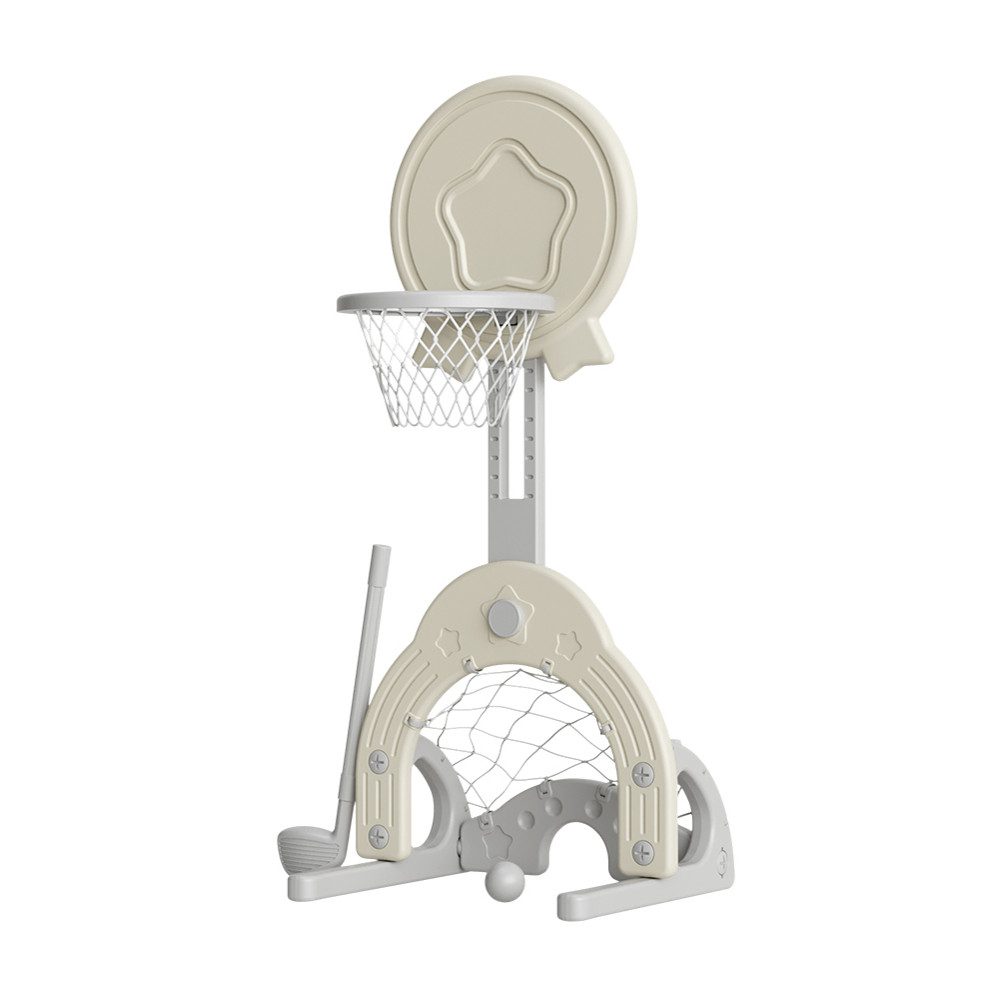 Ten regulowany do ykówki jest również wyposażony w małą bramkę do piłki nożnej i kij golfowy z piłką. Już dzieci w wieku 3 lat mogą ćwiczyć rzuty, kopanie do bramki lub prawidłowe trafienia w golfa!