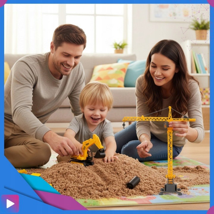 - Bawisz się realistycznie – piasek kinetyczny i ruchomy dźwig tworzą prawdziwy klimat budowy.