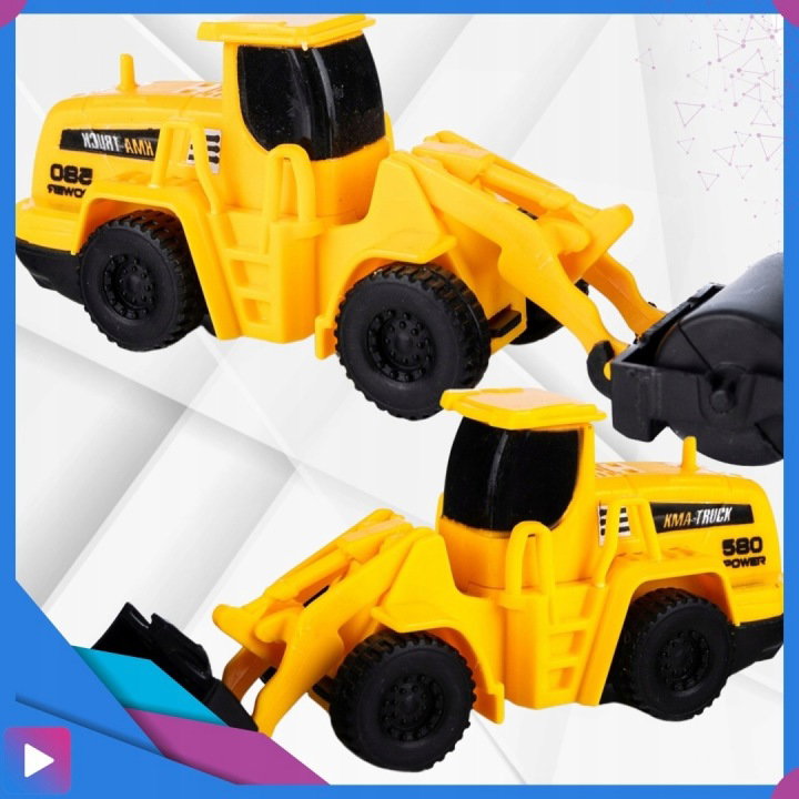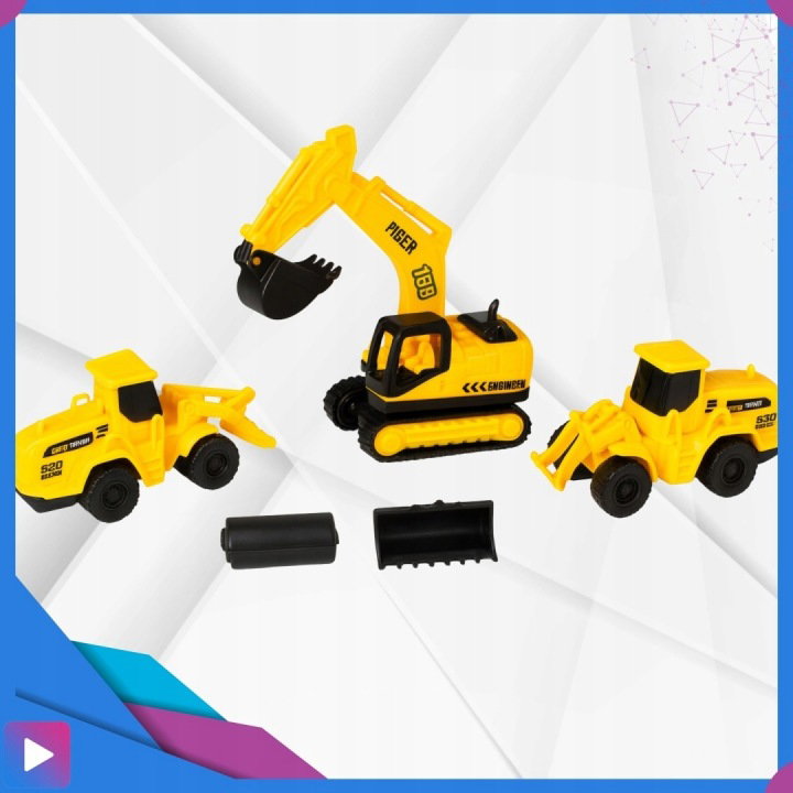 - Trzy pojazdy budowlane – dwa spychacze i koparka dla jeszcze większej frajdy z zabawy.