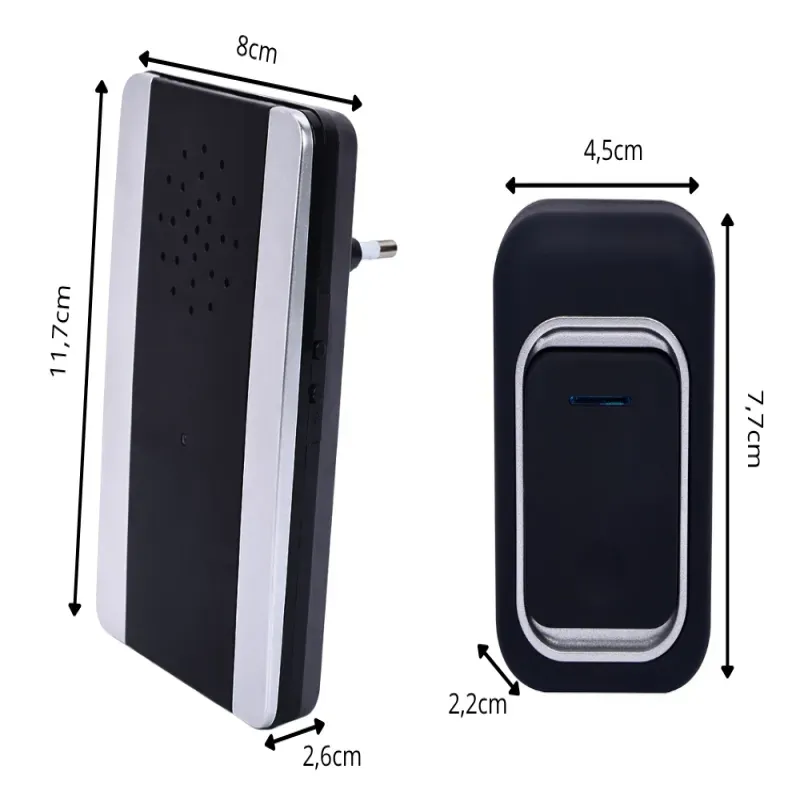 Nowoczesny bezprzewodowy dzwonek to wygodne i bezobsługowe rozwiązanie do domu, mieszkania lub biura. Nadajniki można jednocześnie połączyć z jednym odbiornikiem. Ich estetyczny wygląd sprawia, że doskonale pasują do każdej furtki, głównych drzwi oraz wejścia od trasu.
