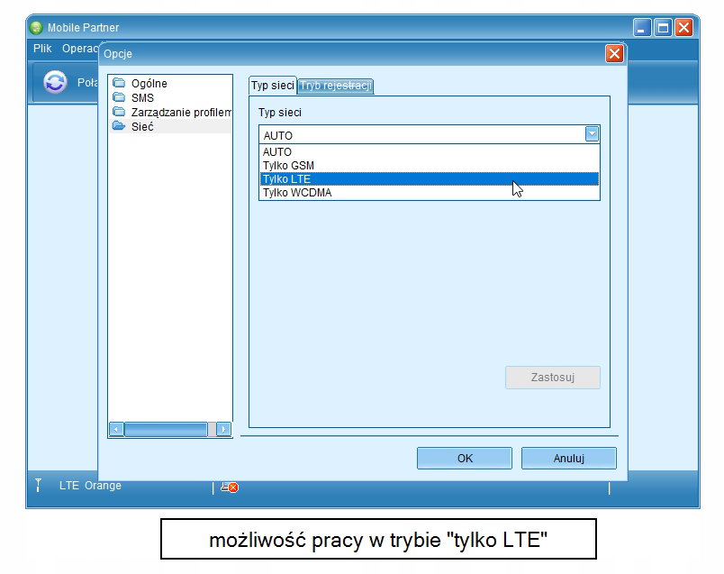 - różne tryby pracy - Tylko LTE, Tylko 3G i Auto