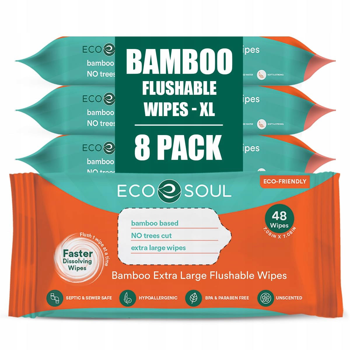 - Chusteczki nawilżane ECO SOUL, przyjazne dla środowiska, z bambusem, bezpieczne dla szamba, 8 opakowań po 64 sztuk zapewniające długotrwałą wygodę.