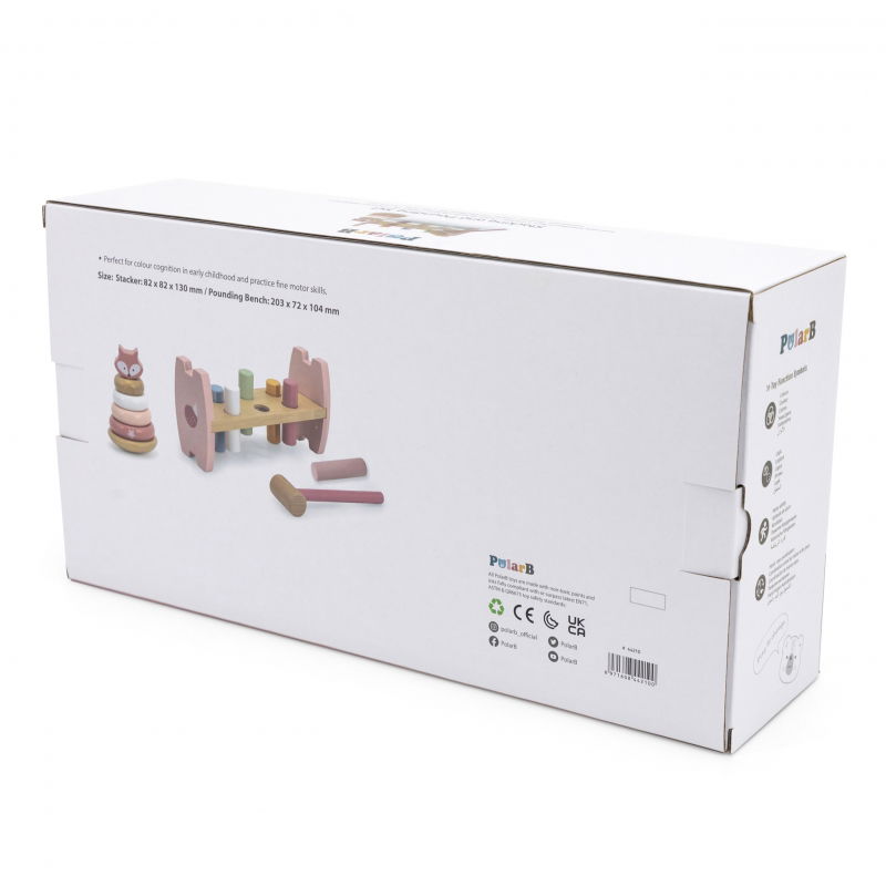 Zawiera dwie pastelowe, drewniane zabawki: piramidkę edukacyjną oraz przebijak z młoteczkiem, obie ozdobione słodkim pingwinkiem. Piramidka zachęca do ułożenia kolorowych kloców w odpowiedniej kolejności, rozwijając równocześnie koordynację ręka-oko i wyobraźnię dziecka. Natomiast przebijak pozwala na wbijanie kolorowych kołeczków załączonym młoteczkiem, stymulując sprawność rączek i logiczne myślenie. Ponadto, dzięki zabawie z tym zestawem, dziecko naukę kolorów i rozwija precyzję ruchów, co w przyszłości może ułatwić mu naukę pisania. To doskonała propozycja dla małych odkrywców, którzy chcą jednocześnie bawić się i rozwijać swoje umiejętności!