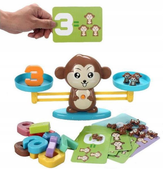 Zabawka wielofunkcyjna. Waga do nauki liczenia z liczbami odpowiadającymi wadze małpek koniecznych do położenia na drugiej szali. Masa zabawy i nauka w jednym! Dodatkowo karty z obrazkowymi podpowiedziami!