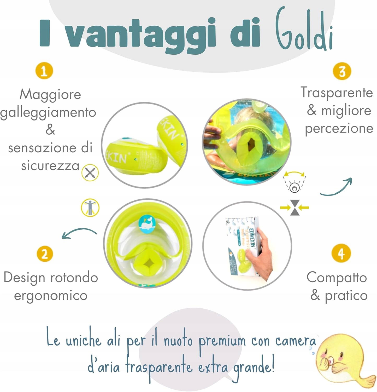 ✔ Najwyższa jakość i maksymalny komfort: podłokietniki Goldi wykonane są ze wzmocnionego materiału, wolnego od BPA i przyjaznego dla środowiska zgodnie z rozporządzeniem REACH, dzięki czemu są bezpieczne, trwałe i wygodne w noszeniu. Dwie niezależne komory powietrza o podwójnym funkcjonowaniu o zoptymalizowanym współczynniku głośności zapewniają maksymalny komfort.