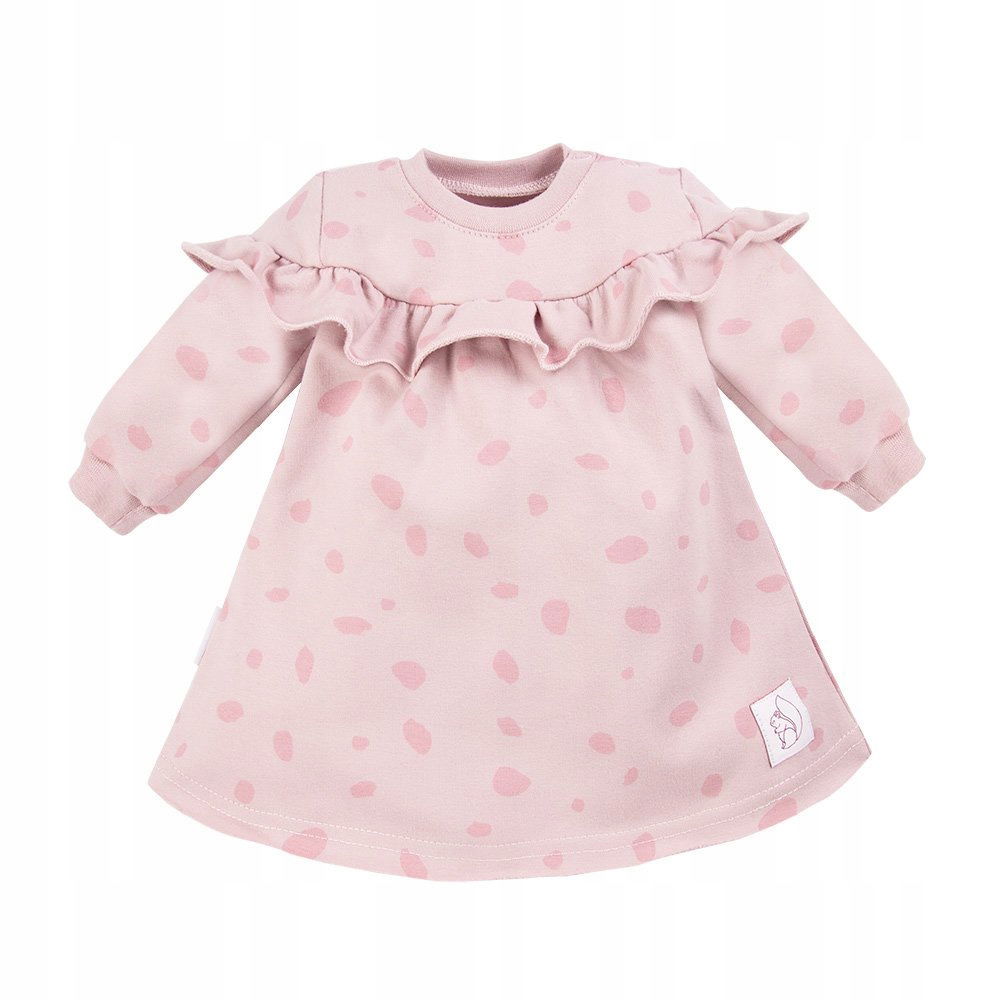 Dziecięca sukienka dresowa z kolekcji "Unique" uszyta z miękkiej i przyjemnej w dotyku dzianiny dresowej. Sukienka jest rozpinana na ramionku do rozmiaru 80. Elementem ozdobnym jest naszywka. Sukienka posiada wszytą uroczą falbankę. Sukienka dziecięca idealna na spacery oraz zabawę na placu zabaw. Z legginsami dresowymi z tej samej kolekcji stworzy śliczny komplet.