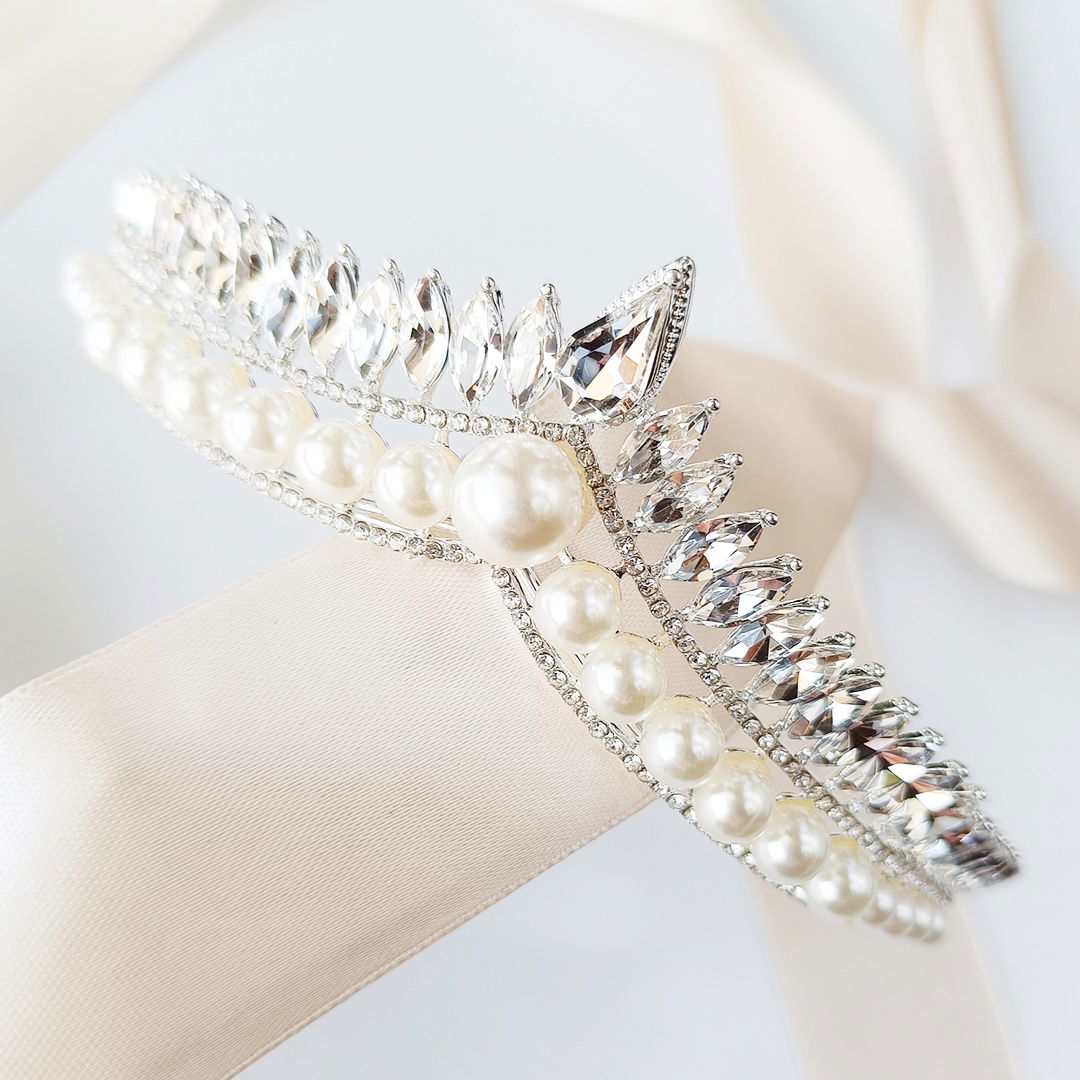 EFEKTOWNA bogata błyszcząca tiara diadem KORONA kryształki PERŁY srebrna