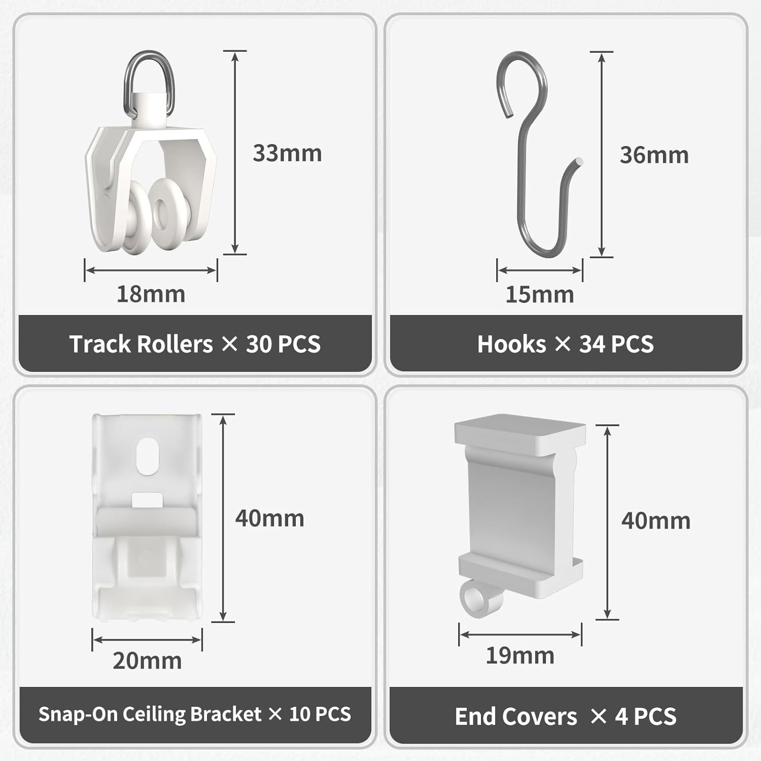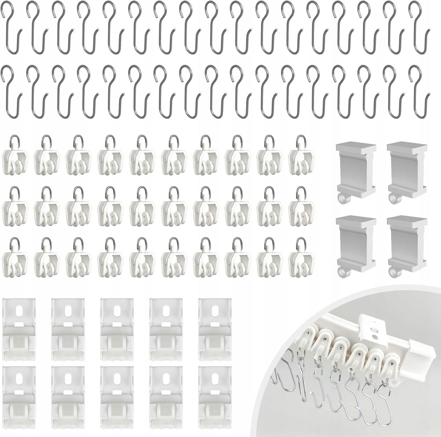 Opakowanie zawiera - 34 haczyki metalowe + 30 rolek szynowych + 10 wsporników sufitu dociskowego + 4 zaślepki. Dobra ilość, idealna do wymiany lub wymiany akcesoriów do karniszy.