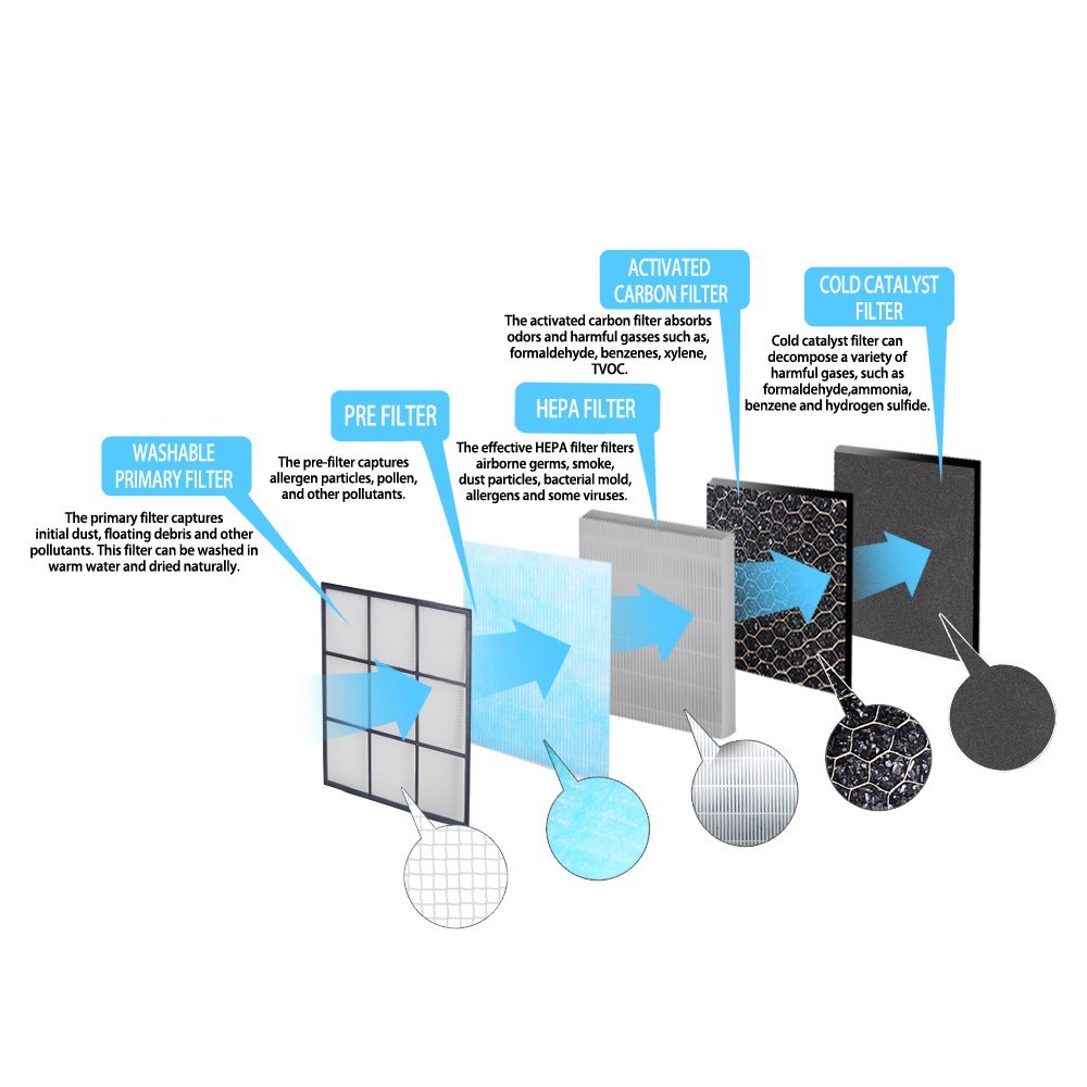 Filtr 5-stopniowy. Składa się z filtra podstawowego, filtra wstępnego, filtra z aktywnym węglem, filtra HEPA H13 i zimnego filtra katalitycznego. Skuteczność filtra HEPA: 99,99% Wielkość filtra: 28.0 x 28.0 x 3.5 [cm]