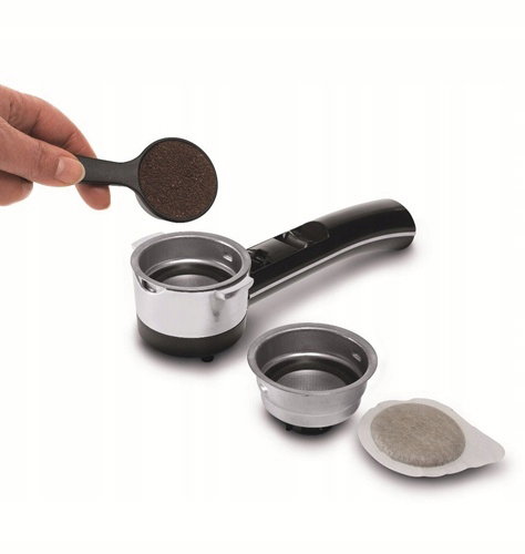 - Produkt wyposażony został w specjalny adapter Filtr Crema, który umożliwia stosowanie w ekspresie zarówno kawy w saszetkach, jak i mielonej.
