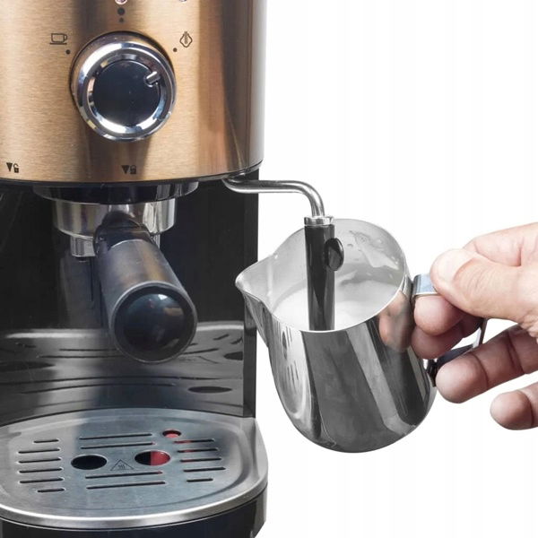 Ten ciśnieniowy kolbowy ekspres dysponuje mocą 1450 W.