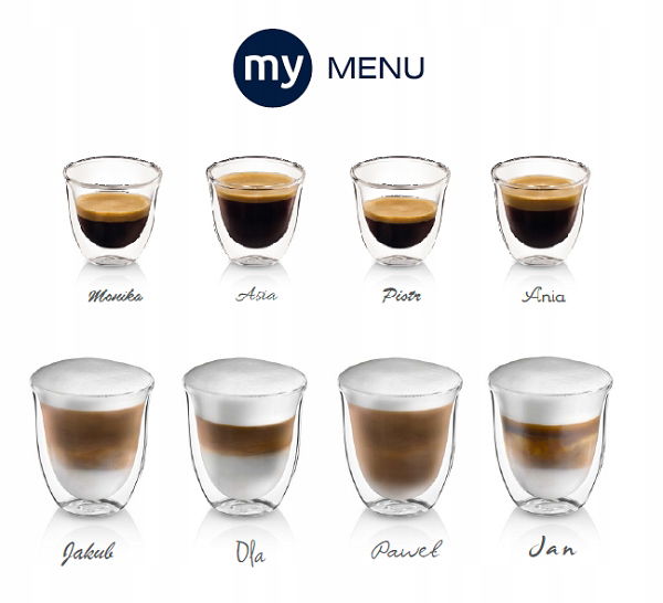 - Funkcja „My Menu“: możliwość personalizacji każdego napoju poprzez wybór aromatu oraz proporcji kawy i mleka